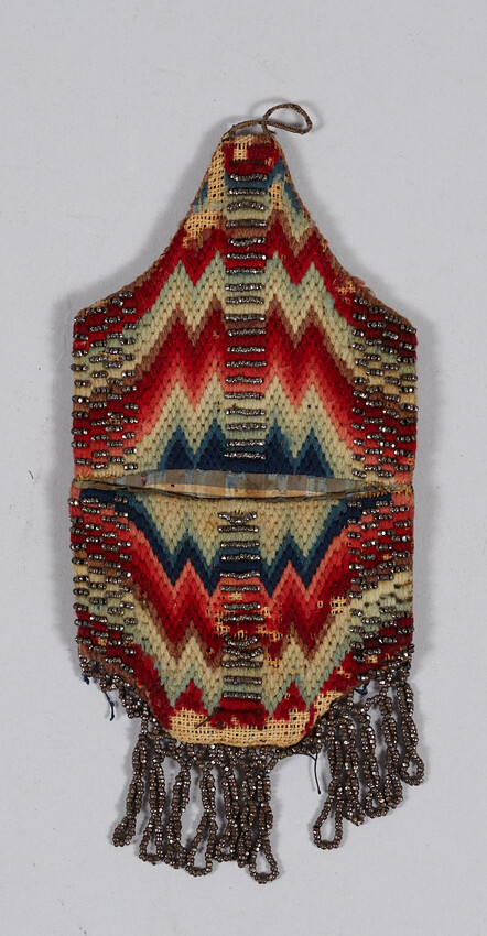 This fan is constructed from an ivory-colored silk moiré leaf decorated with painted floral sprays in pastel colors on recto, single gilt floral spray on verso. Carved ivory sticks and guards set with silver and mirrors, mother-of-pearl washer, with brass ring and ivory-colored silk cord and tassel.