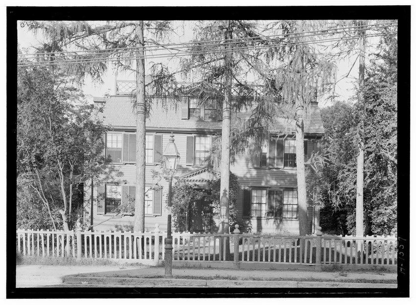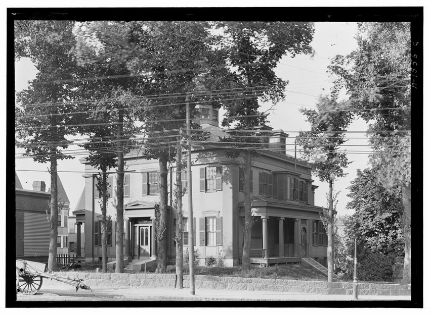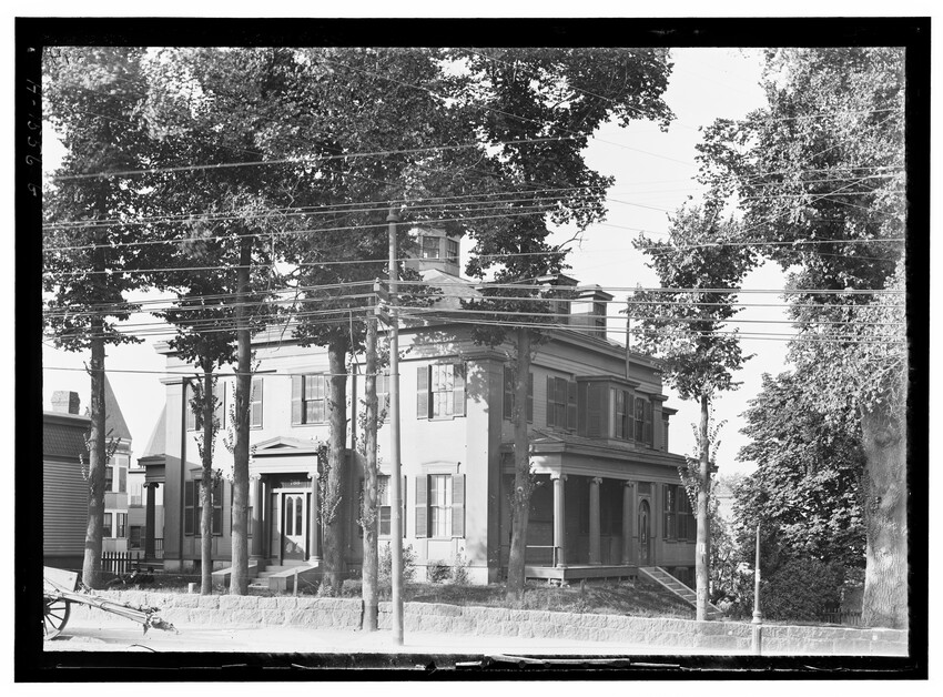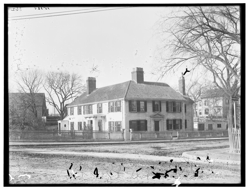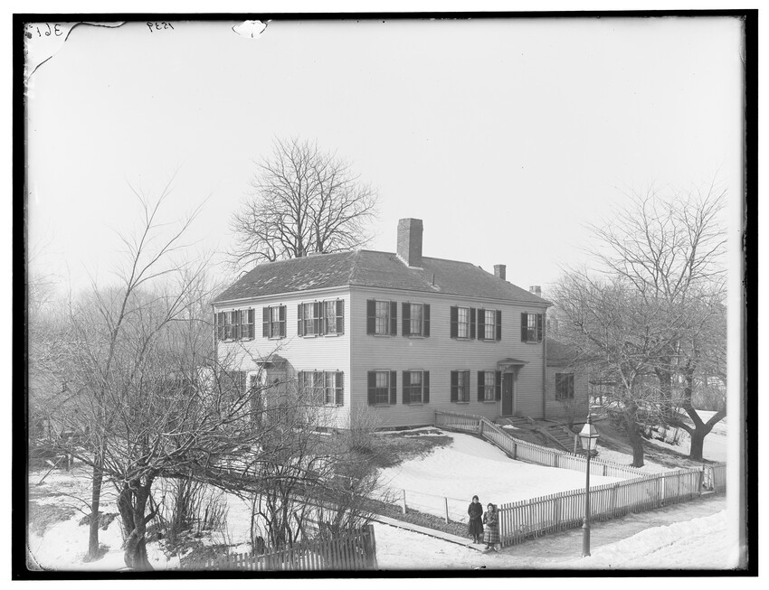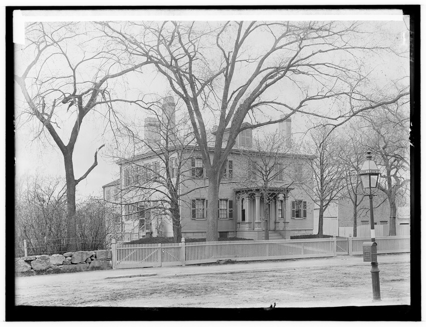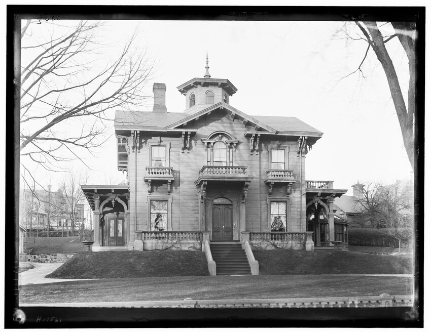 The image shows the Hunt House, a large, ornate, two-story building in Dorchester, Boston, Massachusetts. The house features intricate architectural details, including decorative brackets, a central entrance with a small canopy, and symmetrical windows. A small set of stairs leads to the main door, ...