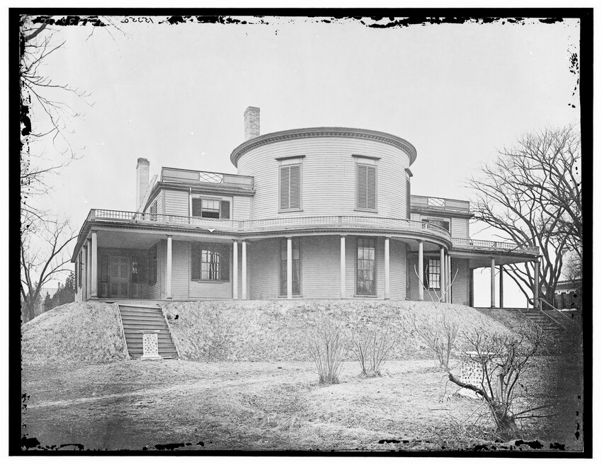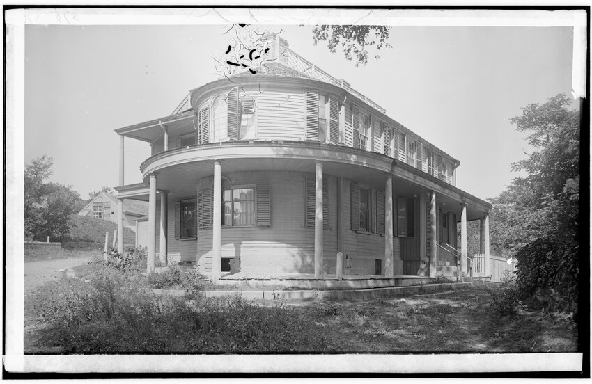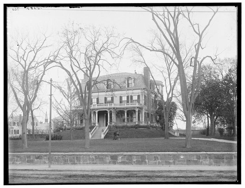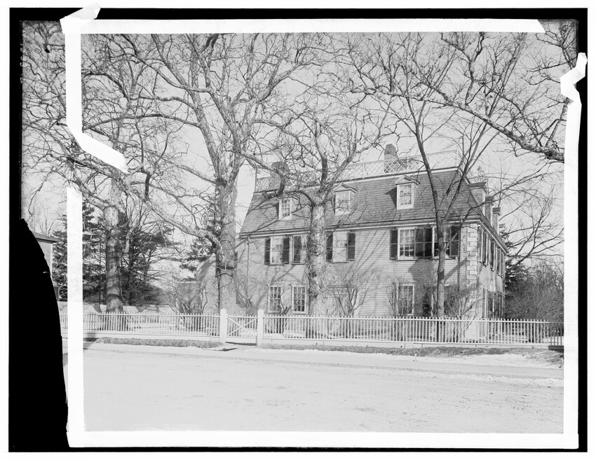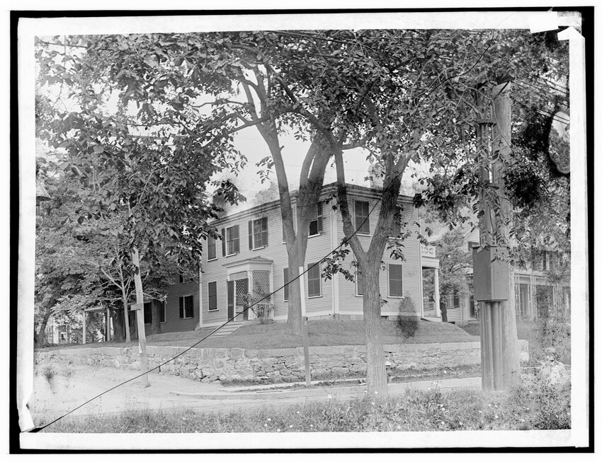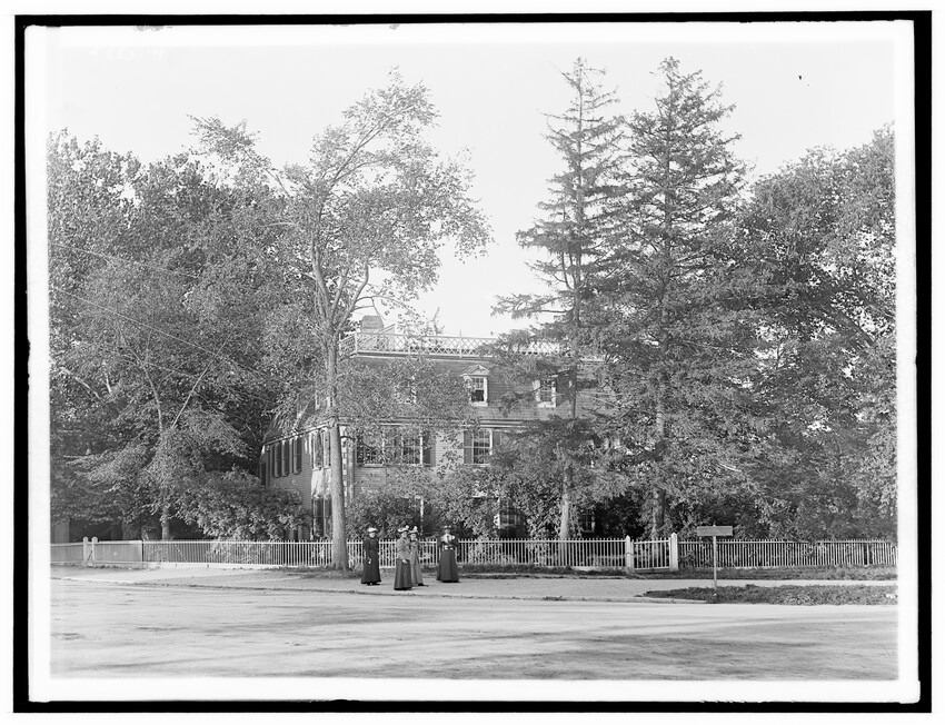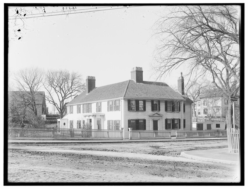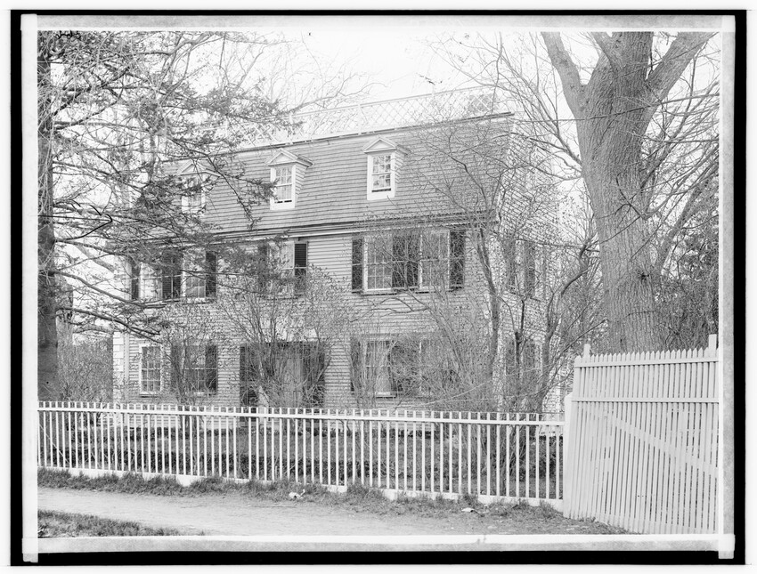 The image shows the Hunt House, a large, ornate, two-story building in Dorchester, Boston, Massachusetts. The house features intricate architectural details, including decorative brackets, a central entrance with a small canopy, and symmetrical windows. A small set of stairs leads to the main door, ...