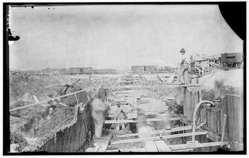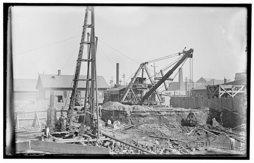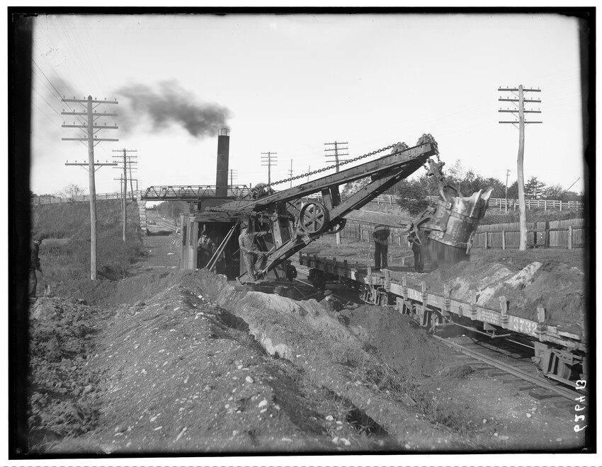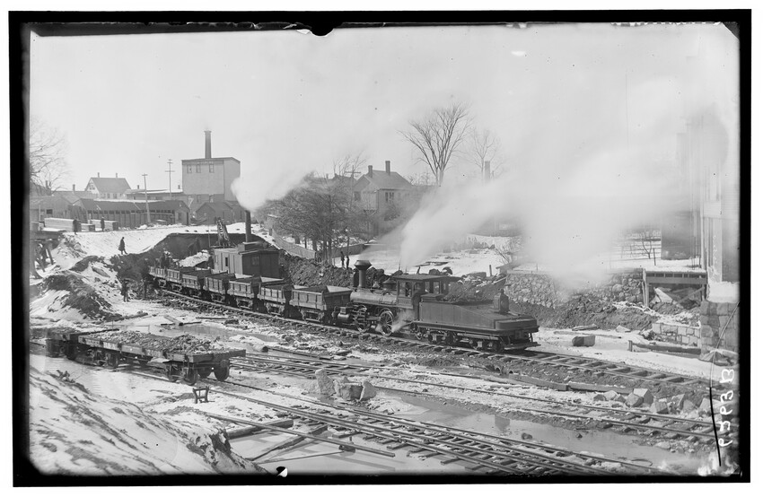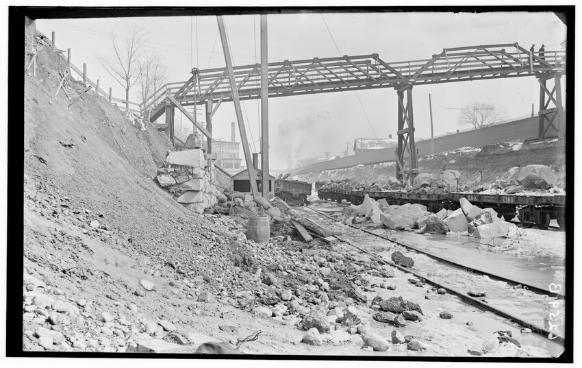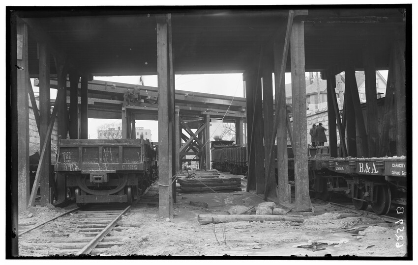 Placing of girders at Cypress Street, Brookline Hills station, Brookline, Massachusetts, 6228-B Placing of 8th 5 foot pipe to carry Laundry Brook, project of lowering tracks, Newton, Massachusetts, 6229-B Faneuil - Sewer Crossing of tracks, Boston, Massachusetts, 6230-B Excavation near tower #9, Beacon Park Yard, Allston, Boston, Massachusetts, 6231-B Coal pocket construction, Beacon Park Yard, Allston, Boston, Massachusetts, 6232-B Beacon Park Yard engine house roof construction, Allston, Boston, Massachusetts, 6233-B General view of Beacon Park Yard from top of gas tanks, Cambridge shown across the river, Allston, Boston, Massachusetts, 6234-B Support for tracks at Faneuil during construction of bridge, Boston, Massachusetts, 6235-B Exeter Street and Huntington Avenue Yard, showing storehouse construction (erecting chimney), Boston, Massachusetts, 6236-B Exeter Street and Huntington Avenue Yard, showing storehouse construction (erecting chimney), Boston, Massachusetts, 6237-B Trestle for filling, Forest Hills, Boston, Massachusetts, 6238-B Boston Yard (vicinity of Kneeland Street), construction of coal pocket foundation, old railroad engine and buildings in the background, Boston, Massachusetts, 6239-B Construction of coaling plant, looking east, North Greenbush, New York, 6240-B Construction of repair shops, West Springfield, Massachusetts, 6241-B Scene during construction in Beacon Park Yard, workers handling concrete slabs and houses in the background, Allston, Boston, Massachusetts, 6242-B Construction of new engine house, forms for engine pits, West Springfield, Massachusetts, 6243-B Cut through Holmes Hill, building new line of Boston & Albany around the town (west side), Westborough, Massachusetts, 6244-B Narrow gauge construction train in cut through Holmes Hill, building new line of Boston & Albany around the town (west side), Westborough, Massachusetts, 6245-B Building new line of Boston & Albany around the town (west side), Westborough, Massachusetts, 6246-B Relocating tracks around town (scene at Holmes Hill), Westborough, Massachusetts, 6247-B Derrick Tower and Interlocking Tower, Exeter Street Yard, Boston, Massachusetts, 6248-B Construction of Beacon Park Yard, Allston, Boston, Massachusetts, 6249-B Filling in of the Faneuil dump, showing motor and plow, Boston, Massachusetts, 6250-B Concrete wall construction at Ferdinand Street, showing houses along street, 6251-B Derrick tower at Dartmouth Street; NY, NH, & H. railroad station, Publishing Co. building in the background, Boston, Massachusetts, 6252-B Roundhouse construction at Beacon Park Yard, showing houses in background, Allston, Boston, Massachusetts, 6253-B Pile driver at Main Street, construction of main line, Westborough, Massachusetts, 6254-B Relocation of line around town, east heading (end) of big cut at Holmes Hill, showing houses in the background, Westborough, Massachusetts, 6255-B View of a group of barriers and Fay Brothers Undertakers business, Worcester, Massachusetts, 6256-B Temporary bridges at Main Street, view of houses in the background, Natick, Massachusetts, 6257-B Construction of new station, concrete conduit under north platform of station for Pegan brook, Natick, Massachusetts, 6258-B Lowering of tracks through town and elimination of grade crossing, Natick, Massachusetts, 6259-B Sheathing for the Walcott shop wall during the construction of new station and lowering of tracks, Natick, Massachusetts, 6260-B Sheathing for the Walcott shop wall during the construction of new station and lowering of tracks, Natick, Massachusetts, 6261-B Sheathing for the Walcott shop wall during the construction of new station and lowering of tracks, Natick, Massachusetts, 6262-B Lowering of tracks and elimination of grade crossings, showing North Avenue and early railroad engine, Natick, Massachusetts, 6263-B Lowering of tracks and elimination of grade crossings (west of station), Natick, Massachusetts, 6264-B New track location west of station, Natick, Massachusetts, 6265-B Changing location of Athol Branch, now abandoned and under the Quabbin Reservoir, 6266-B Building of bridge at Cambridge Street, trench for south abutment, Boston, Massachusetts, 6267-B Construction of paint shop in Allston car repair shop, Brighton, Boston, Massachusetts, 6268-B Seven story warehouse construction, excavation at N.W. Corner, East Boston, Massachusetts, 6269-B Seven story warehouse construction, excavation at N.W. Corner, East Boston, Massachusetts, 6270-B Construction of Beacon Park Yard, start of new engine house, Allston, Boston, Massachusetts, 6271-B Elimination of grade crossing, new bridge over Westfield River and view of station, Russell, Massachusetts, 6272-B Elimination of grade crossing, view from east side of tracks looking west, Russell, Massachusetts, 6273-B Elimination of grade crossing, view of masonry taken from track 2 looking west across the river, Russell, Massachusetts, 6274-B Elimination of grade crossing, construction of new bridge, view looking across Westfield River toward the station, Russell, Massachusetts, 6275-B Construction of Beacon Park Yard, Salt Creek culvert, Allston, Boston, Massachusetts, 6276-B Main Street looking north from junction of Russell Street and toward Main Street Crossing of Boston & Albany Railroad, Huntington, Massachusetts, 6177-B