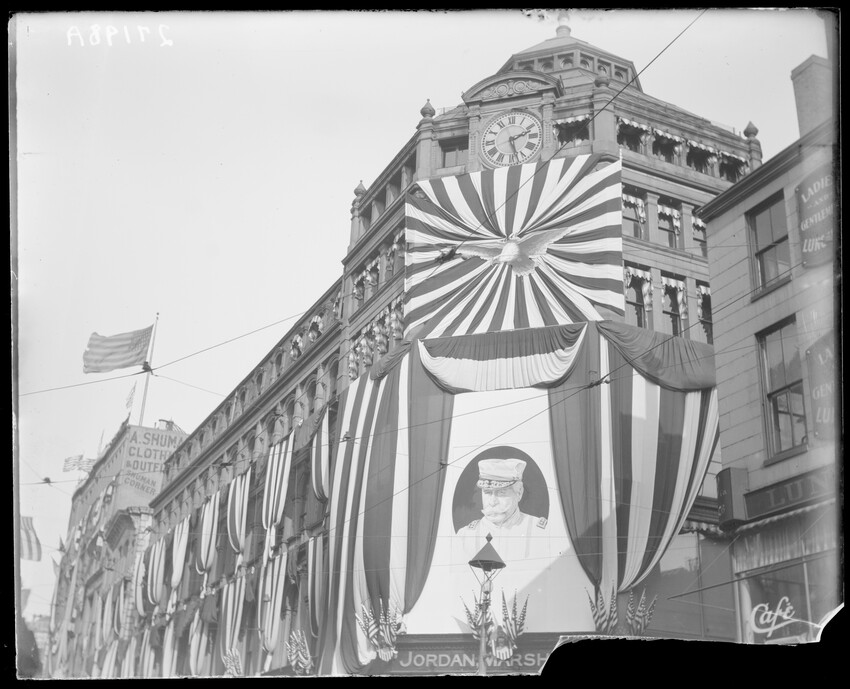 White, oval platter with a deep well, curved sides, and a molded eagle and wheat motif. With the words "Waste Not, Want Not" on the rim.