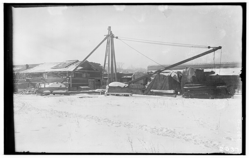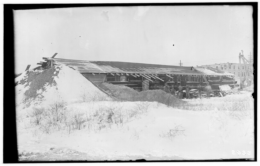 The image shows a shed at Beacon Park Yard in Allston, Boston, Massachusetts. The structure is partially covered in snow, with piles of material, possibly gravel or dirt, visible in front. The shed appears weathered, with several damaged or missing planks on the roof. Buildings and utility poles are...
