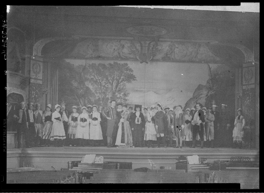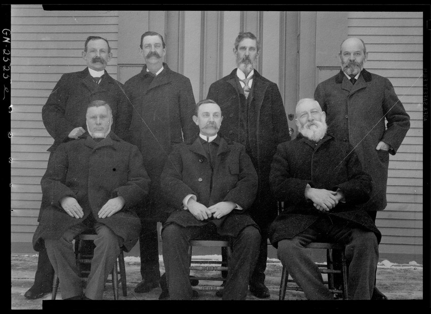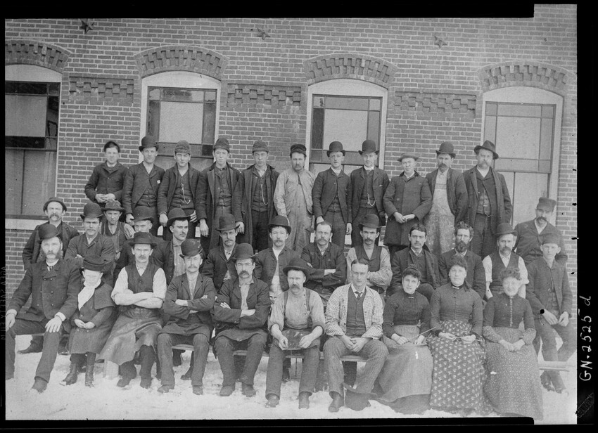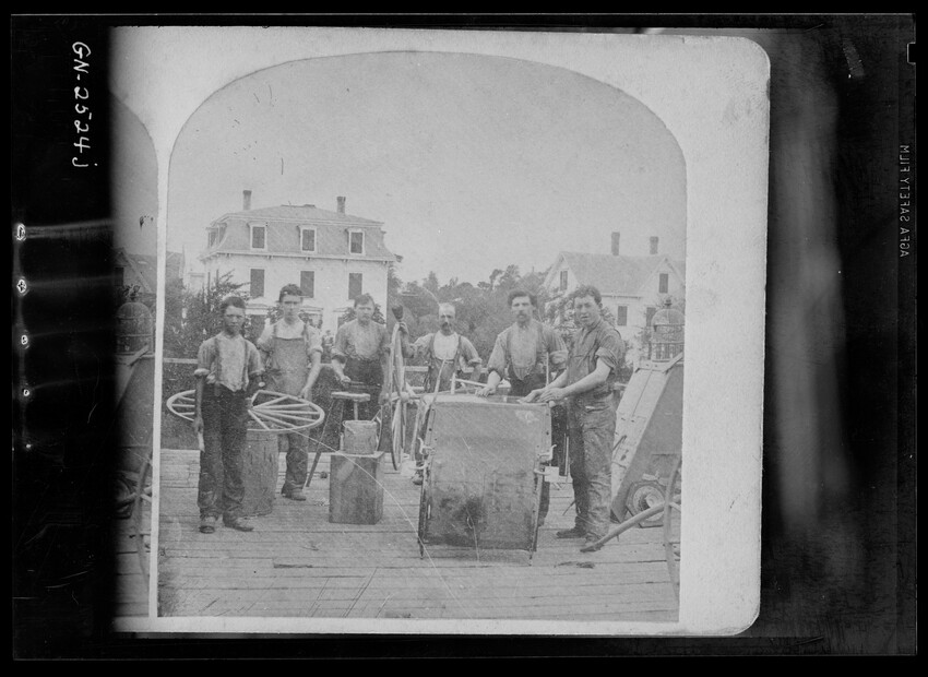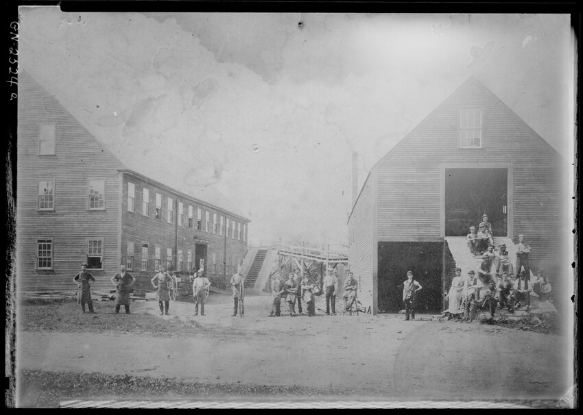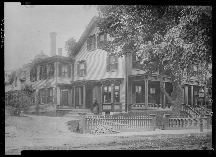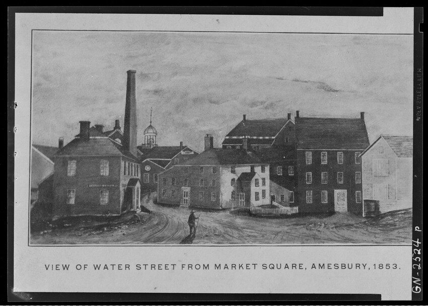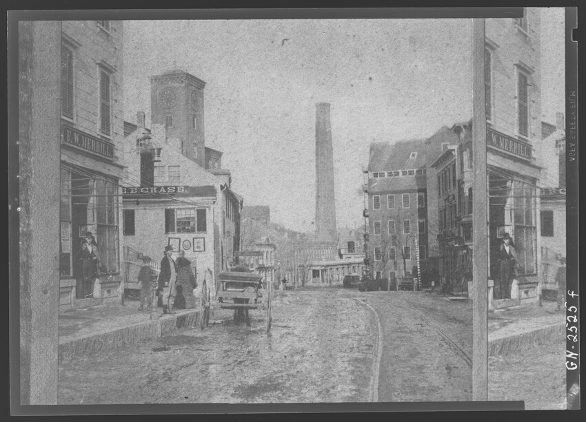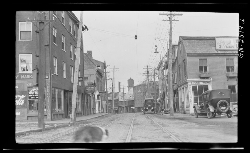 The image depicts Merrimac Street in Newburyport, Massachusetts. Visible are cobblestone streets with streetcar tracks, telephone poles lining the sides, and a series of buildings. To the right is a building labeled "Jere Healey, Coal and Wood," while on the left, there is a shop with a sign reading...