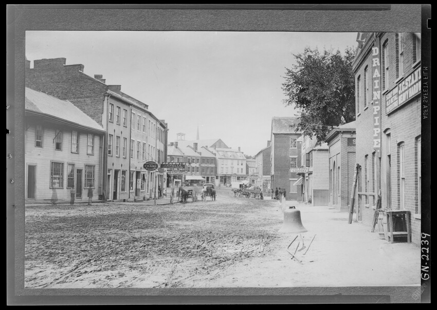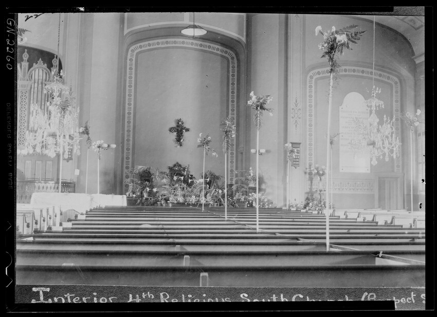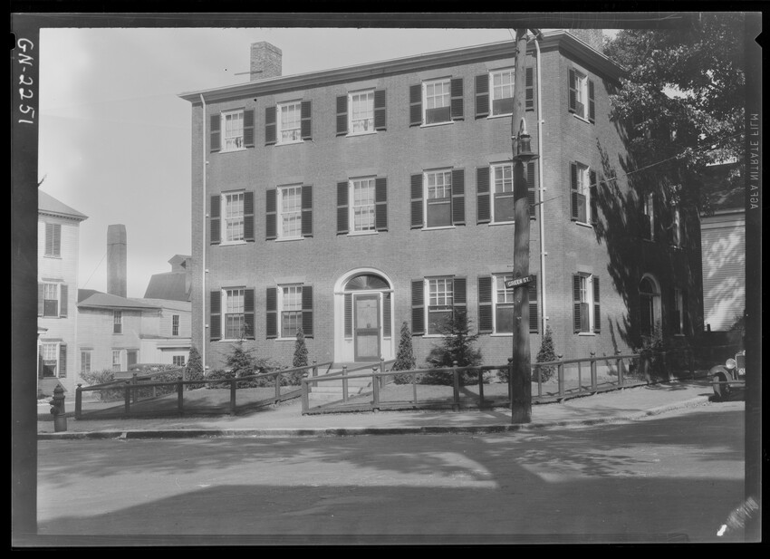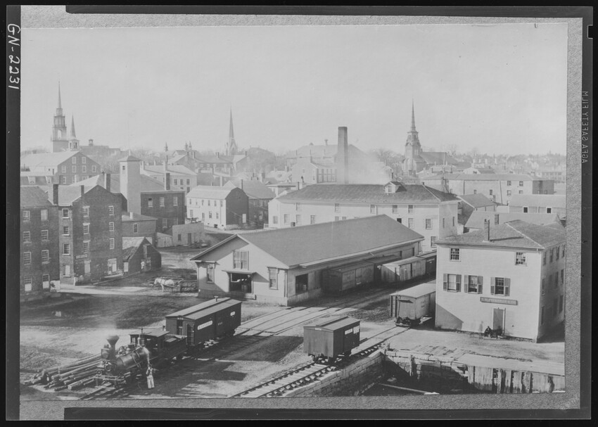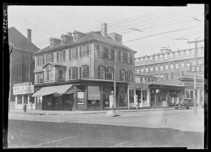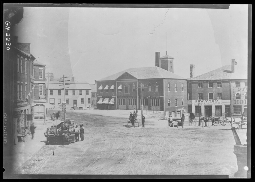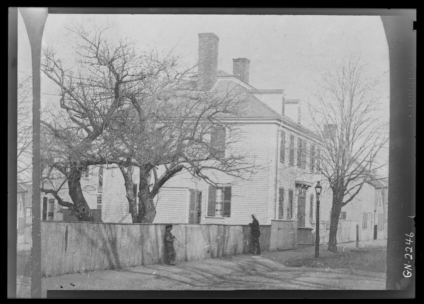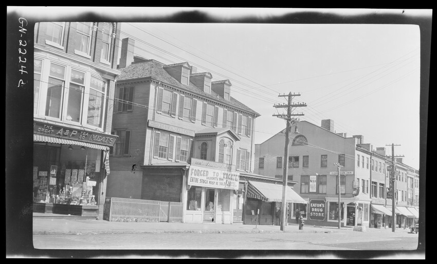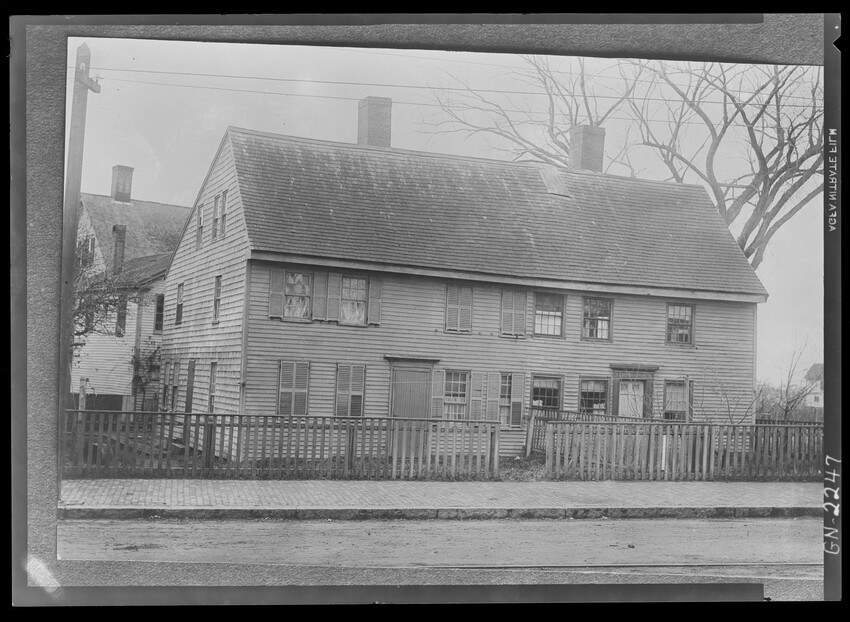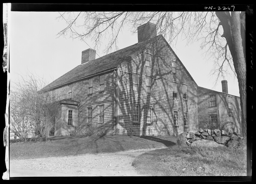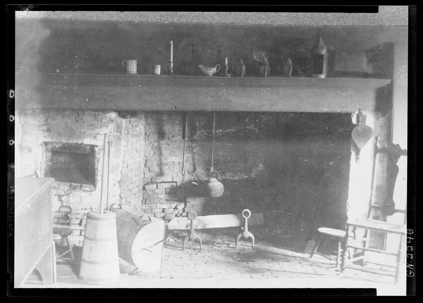 The image depicts a large open fireplace in the Macy-Colby House, Amesbury, Massachusetts. Various cooking utensils, pots, and implements are arranged on and around the hearth, along with a spinning wheel to the right. Above the fireplace, a rifle and powder horn are mounted on the wall. Other house...