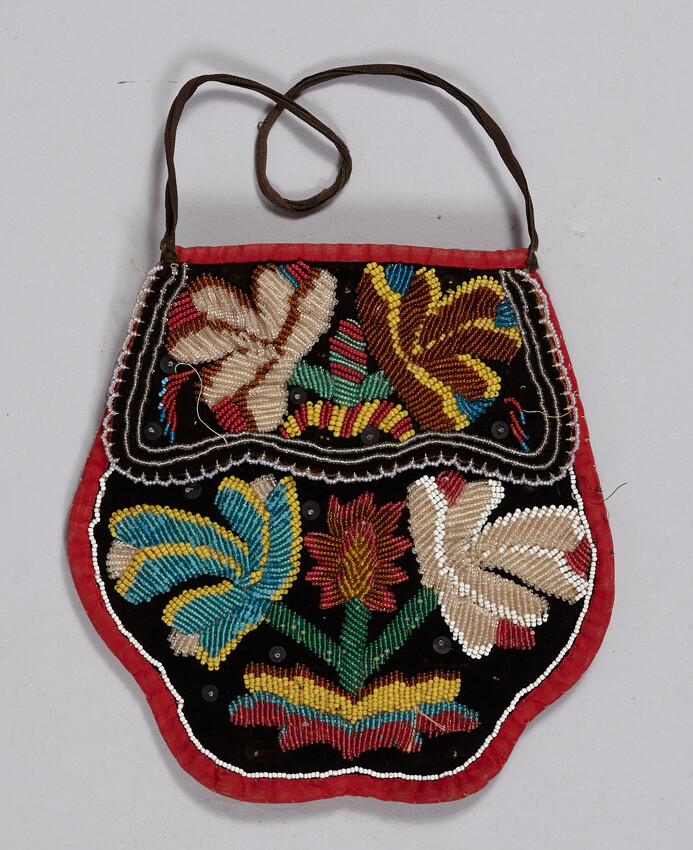 Beaded purse with polychrome floral and abstract pattern and red silk thread tassels at drawstring.