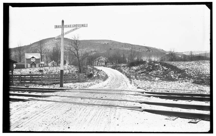 The image depicts a snow-covered rural setting at Edward's Park Crossing in Canaan, New York, looking south. Visible are railroad tracks crossing a road, with a "Railroad Crossing" sign prominently displayed. In the background, there are hills and sparse trees, along with a house to the left side of...