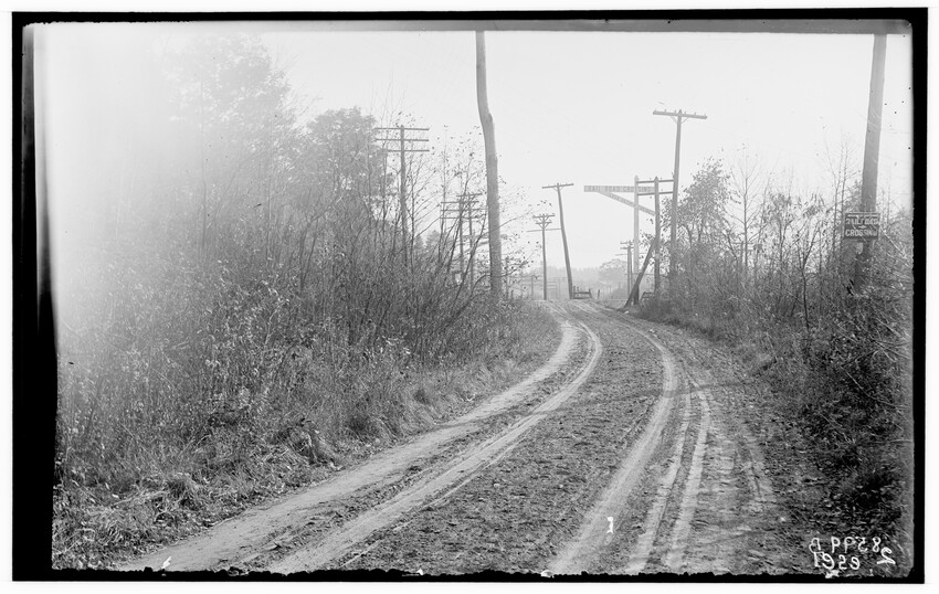 The image shows a rural landscape at Flint's East Crossing in Canaan, New York, facing north. A set of railroad tracks runs across the foreground. In the middle distance, a dirt path or road curves through bushy vegetation towards a distant, hilly horizon. A signpost is visible on the right side of ...