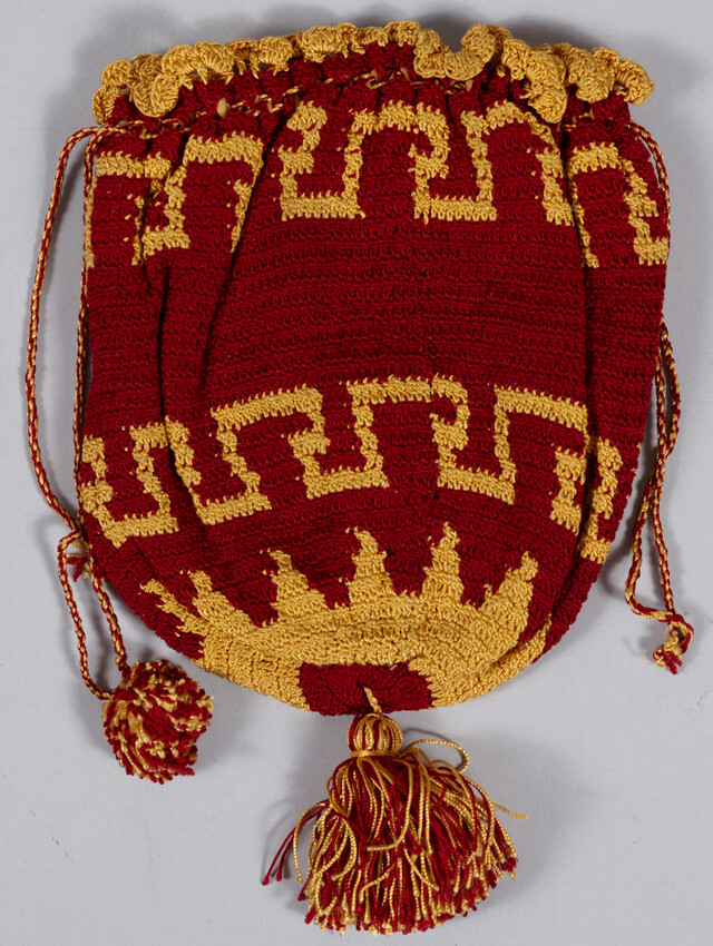 One piece; embroidered floral - light blue, white with maroon center flowers, magenta buds, green leaves on orange gold silk; plain cream satin on back; white leather buttonholes; two gold colored buckles; elastic back straps.