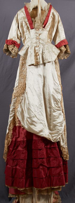 Green silk twill, calash style with four cane hoops; double, piped ruffle at brim, with drawstring of blue silk ribbon; gathered at center back oval panel inserted at center back; wide neck ruffle, quilted with horizontal bands, and lined with down; fully lined with green iridescent silk; narrow gre...