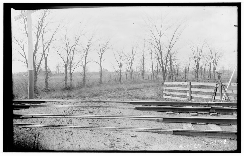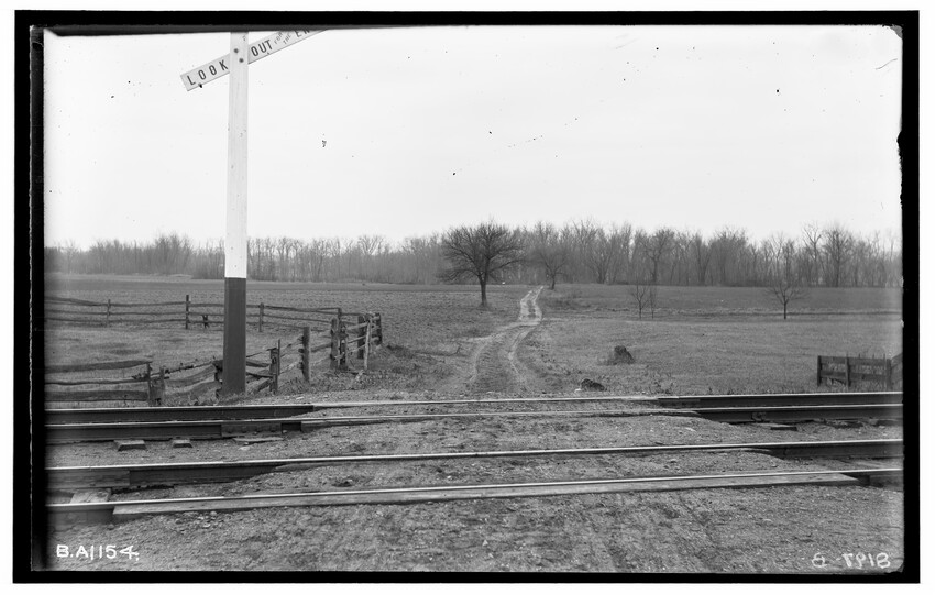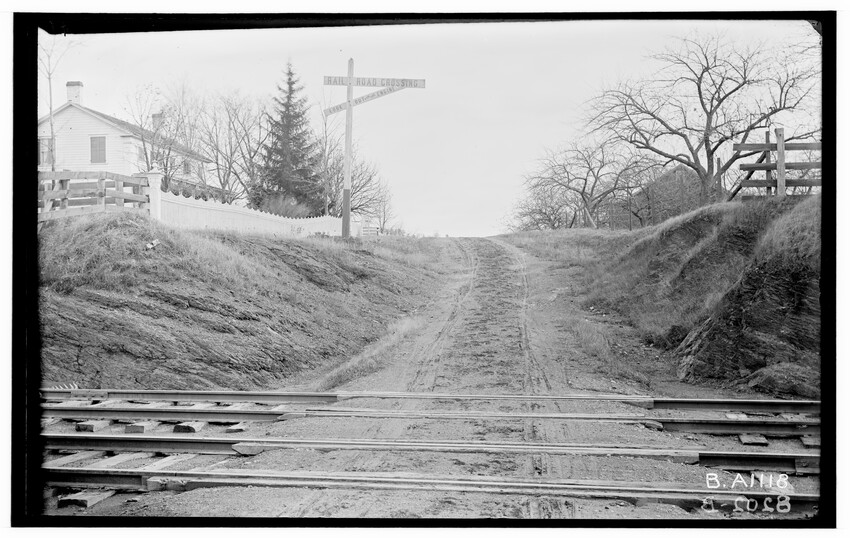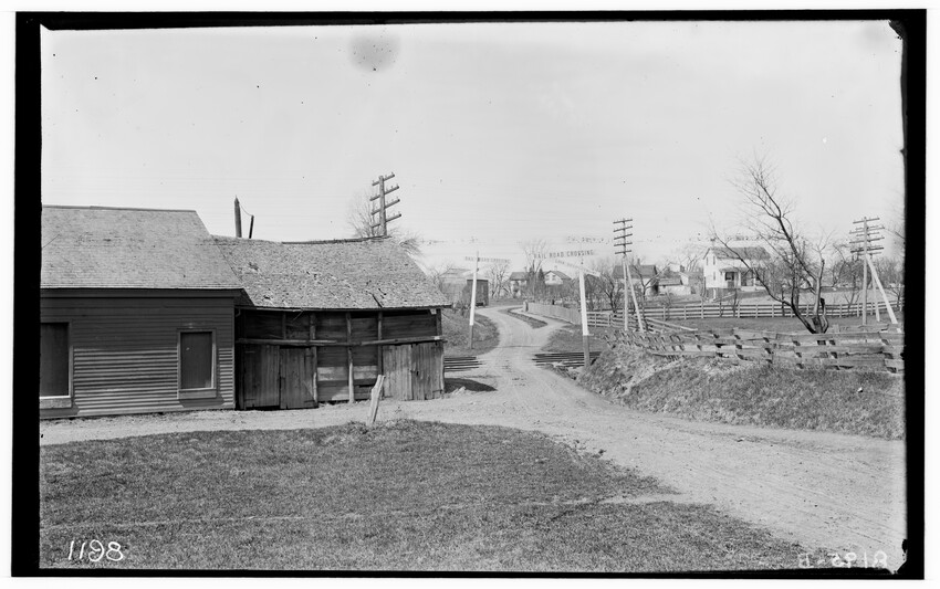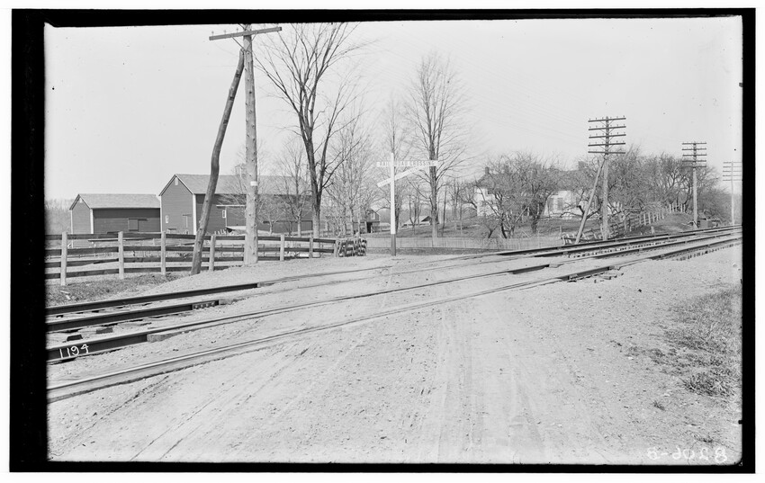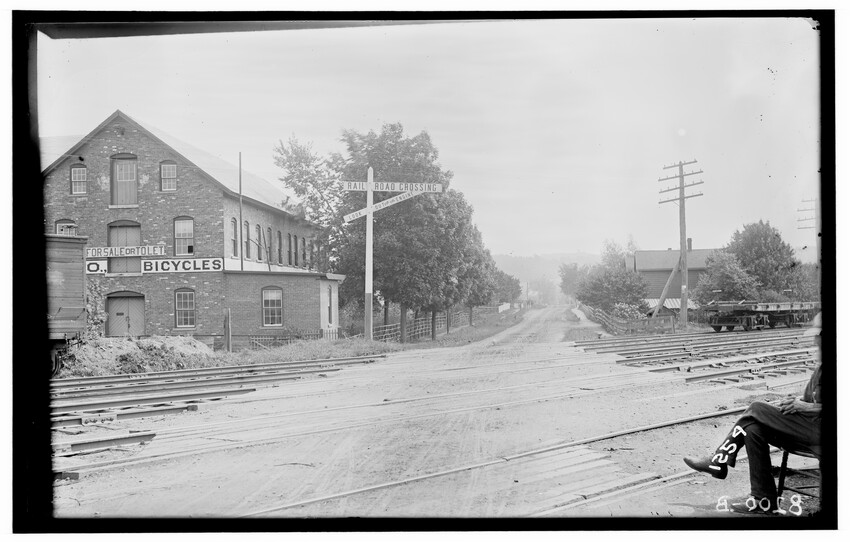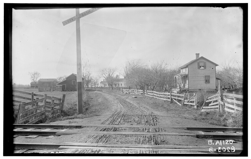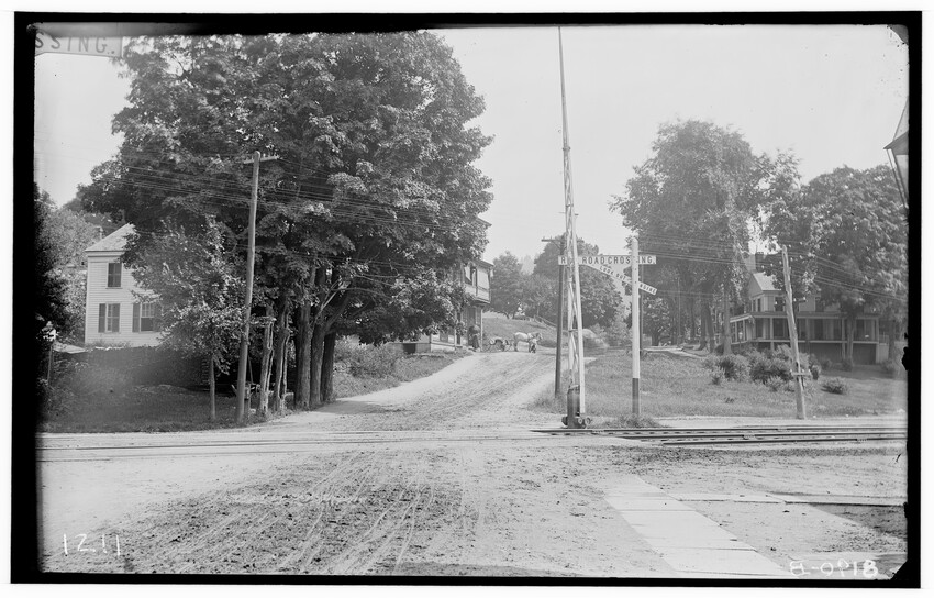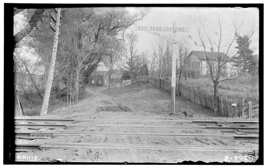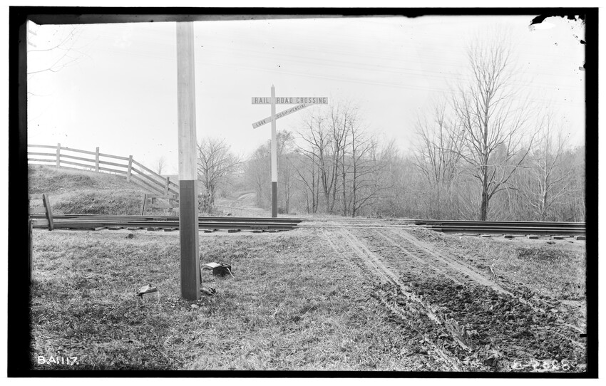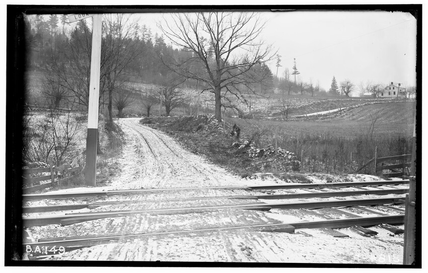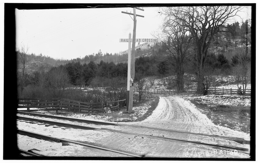 The image depicts Schermerhorn's crossing, located south of the railroad tracks in Schodack, New York. It features a dirt road, railroad tracks, and a "RAILROAD CROSSING" sign. In the background, there are several utility poles, trees, and a few buildings, including farmhouses or barns.
