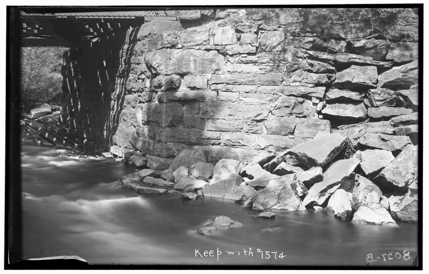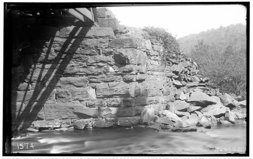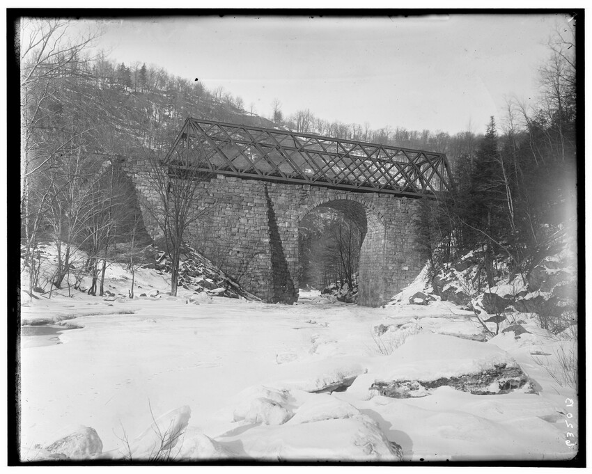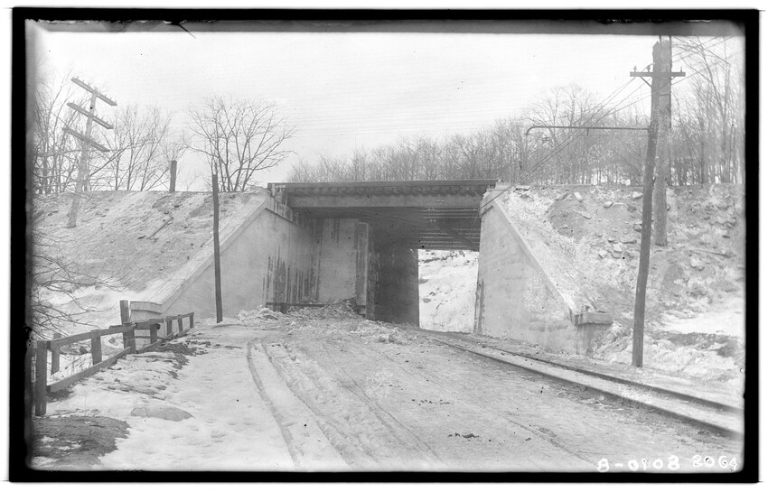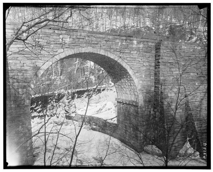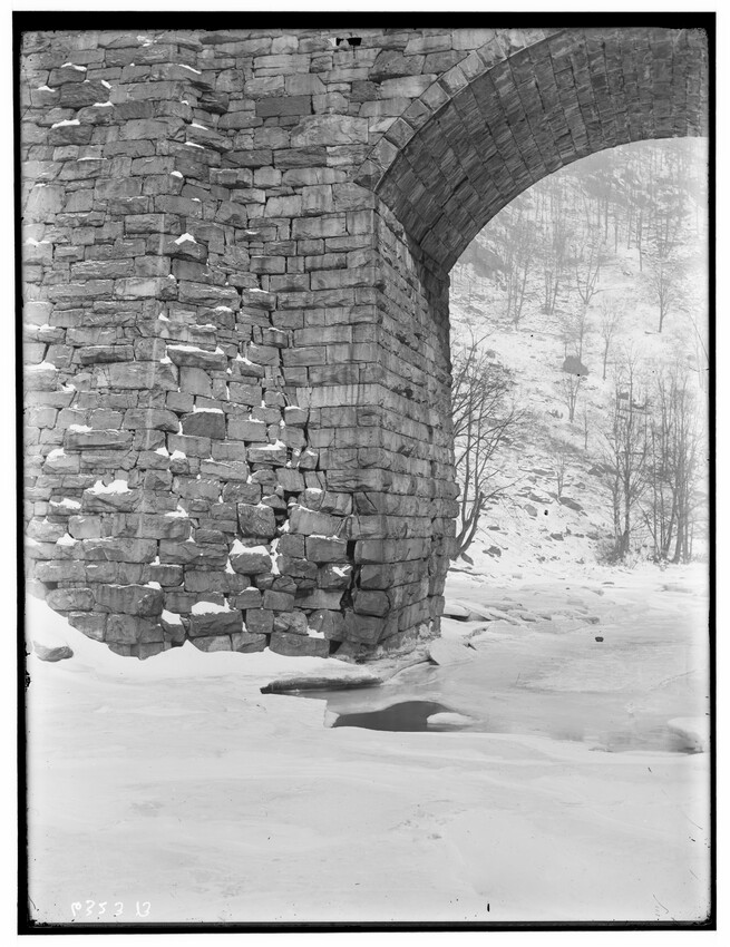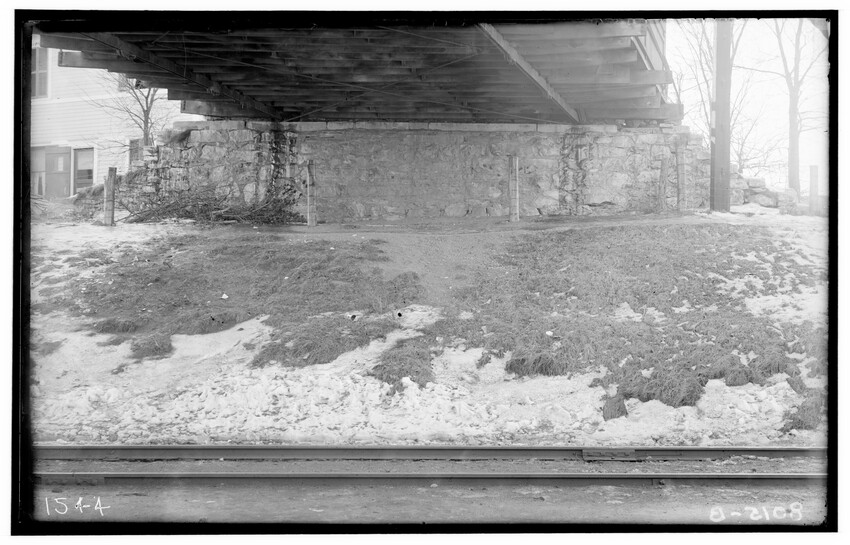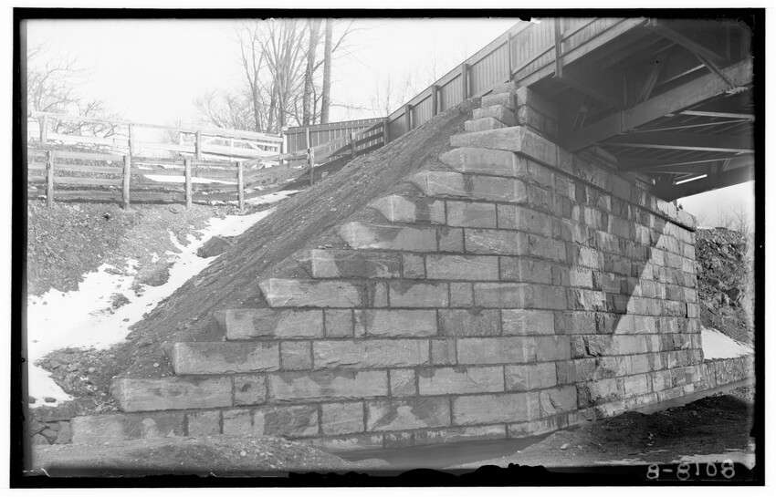 The image shows the Woodlawn Avenue Bridge, specifically the stone abutment supporting the structure. The bridge deck is visible above, constructed with metal supports and wooden railings. There is a sloped embankment leading up to the bridge, partially covered with snow, and a wooden fence runs par...