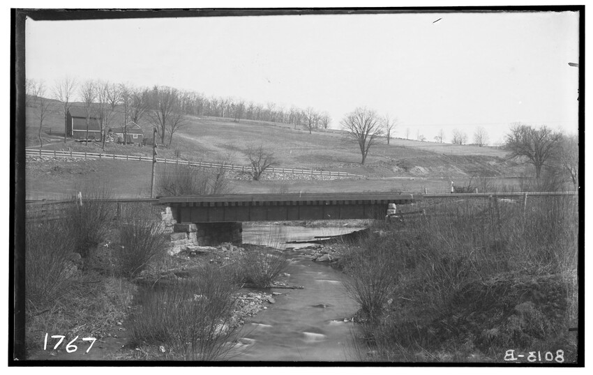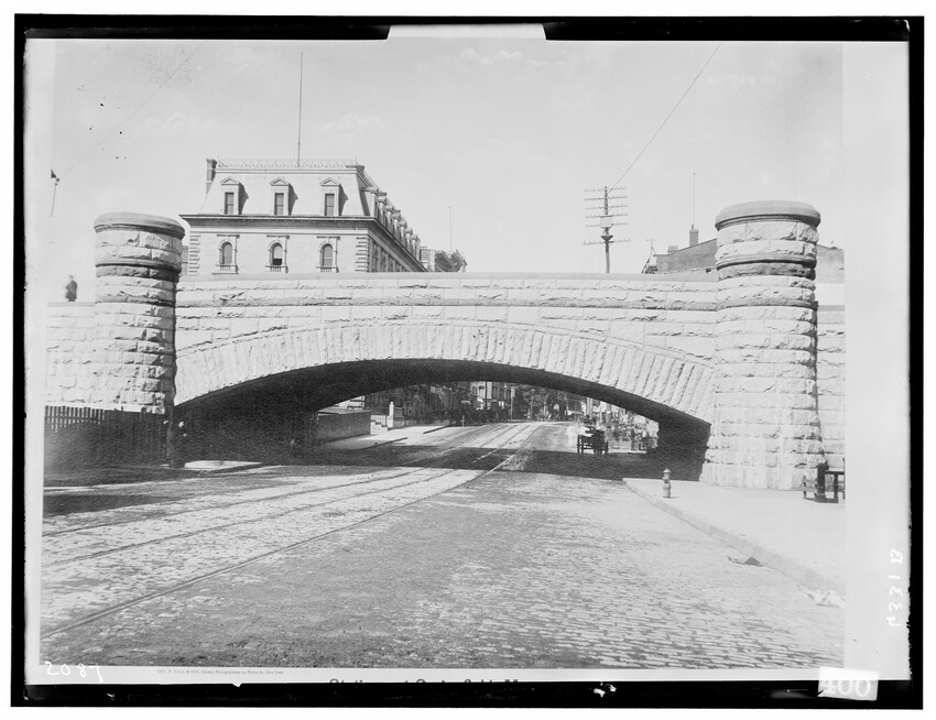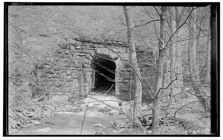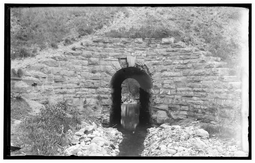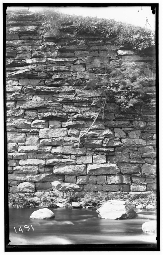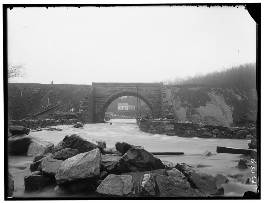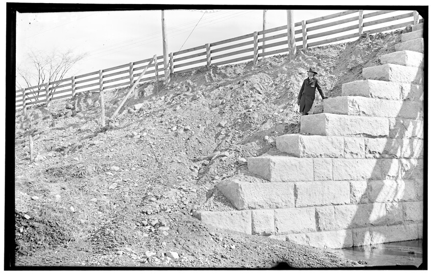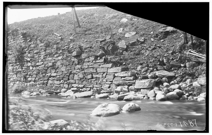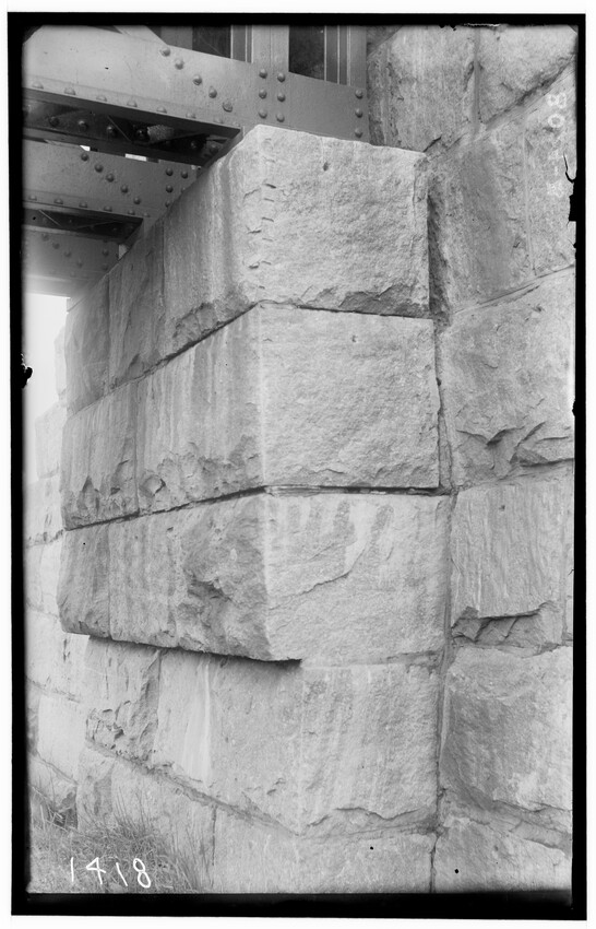 The image shows the Woodlawn Avenue Bridge, specifically the stone abutment supporting the structure. The bridge deck is visible above, constructed with metal supports and wooden railings. There is a sloped embankment leading up to the bridge, partially covered with snow, and a wooden fence runs par...