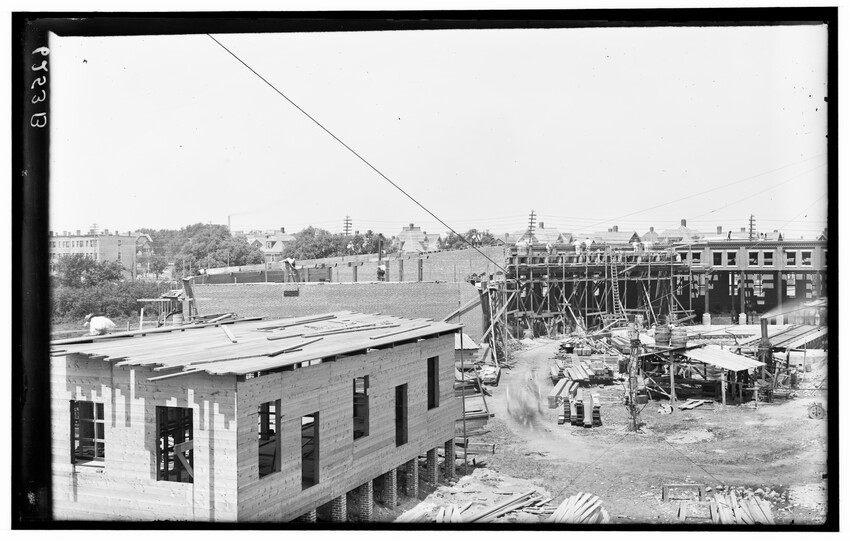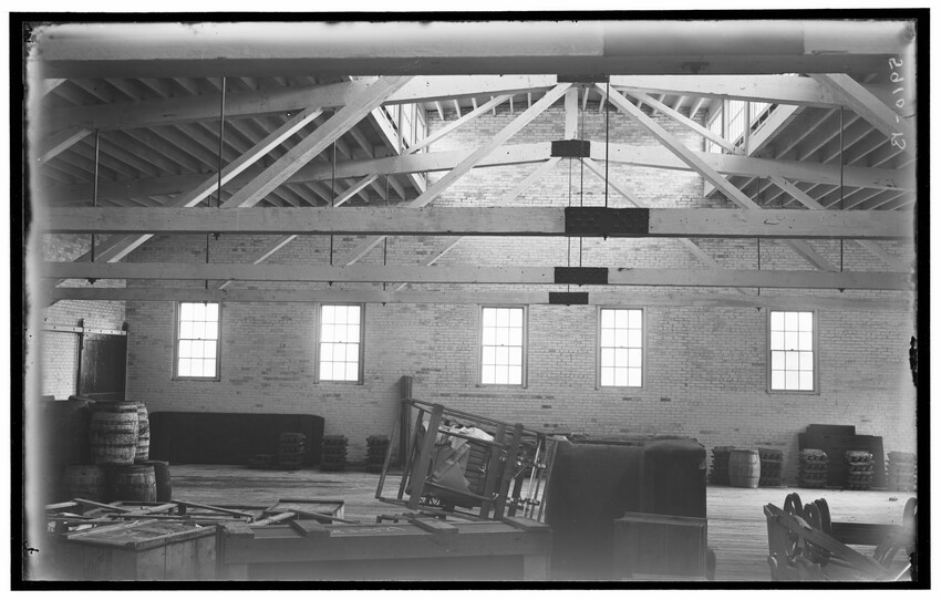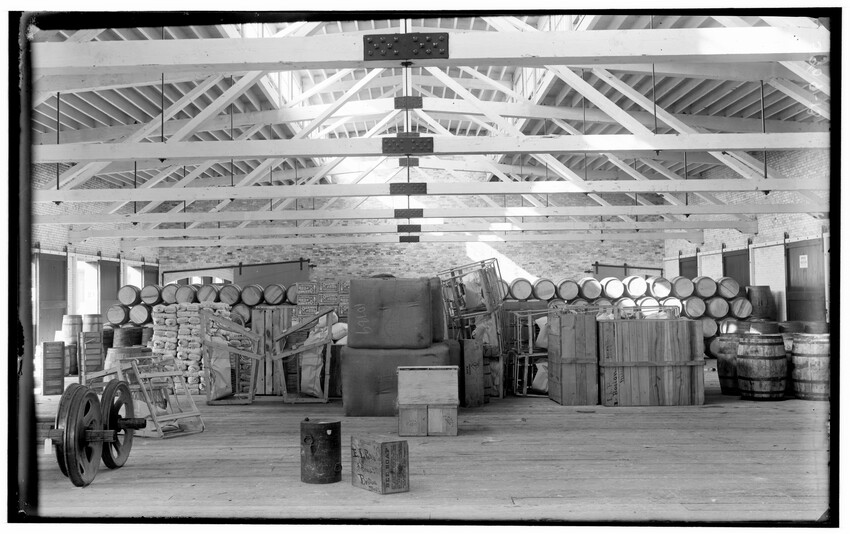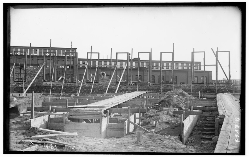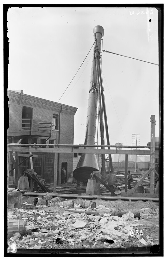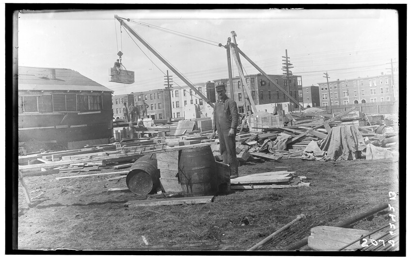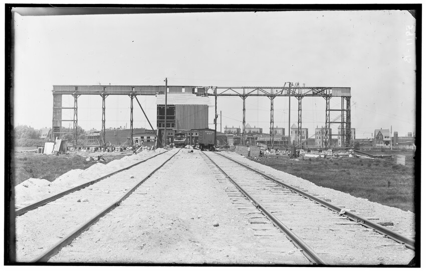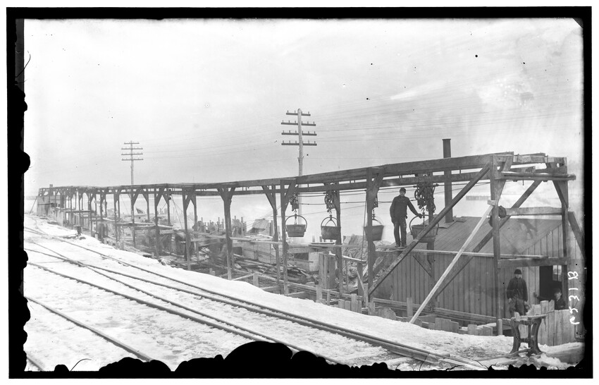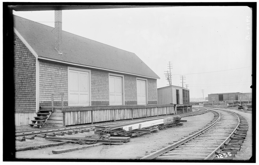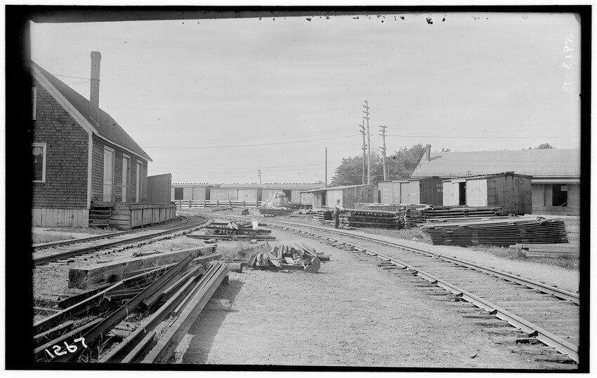 The image depicts a milk shed in Framingham, Massachusetts. Visible are railroad tracks running next to the shed, which has a tall chimney. There are stacked materials, such as wooden planks, alongside the tracks. Additional buildings and boxcars are present in the background.
