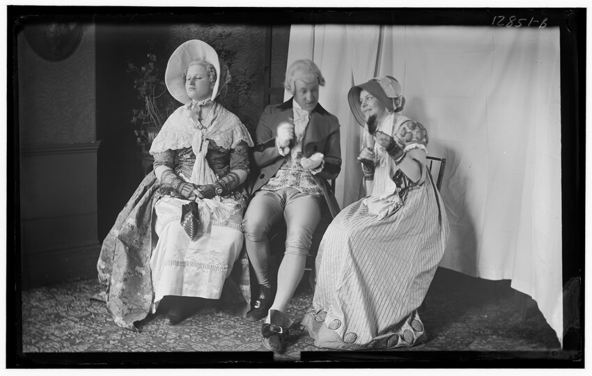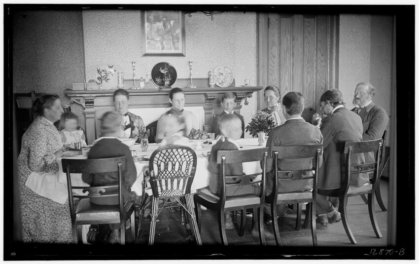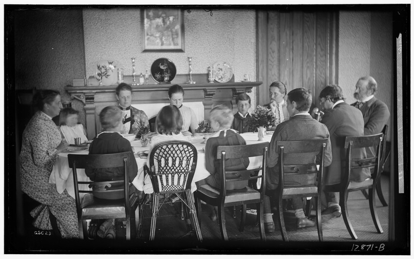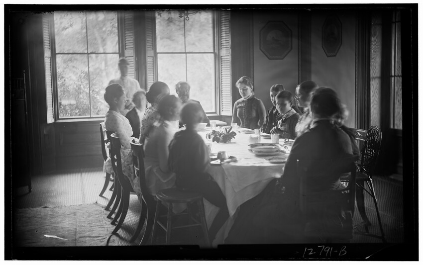 Dinner fork with three tines and a faceted bone handle with a rounded end. Part of a set of twenty-two pieces.