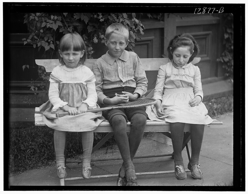 Fork with three tines, a baluster shaft, and a rectangular, faceted handle with a rounded end. Part of set of fifty-two pieces.