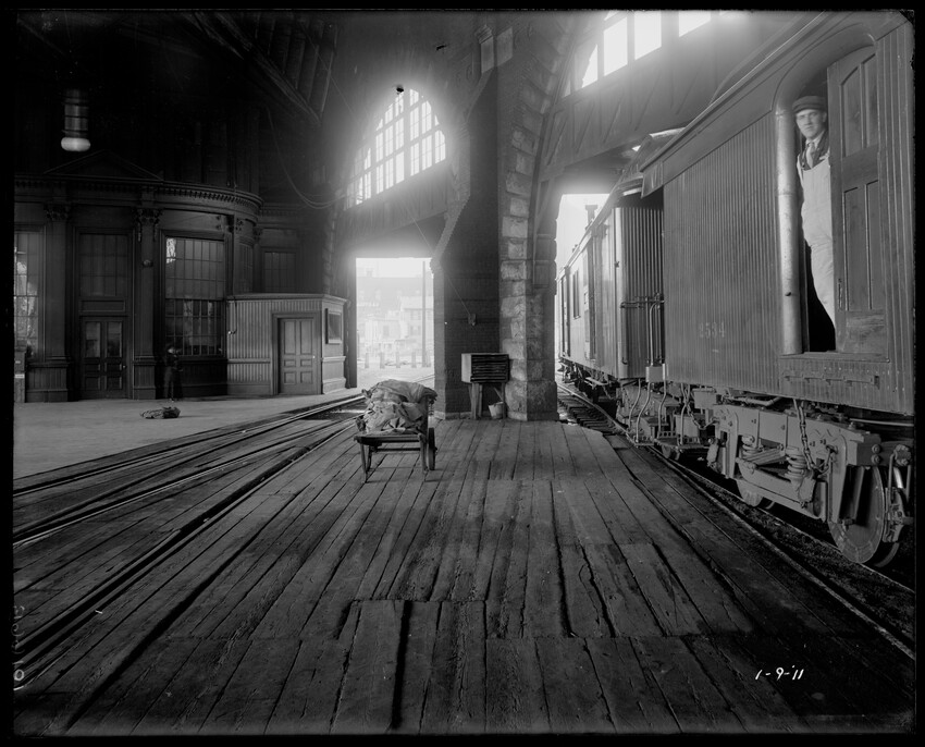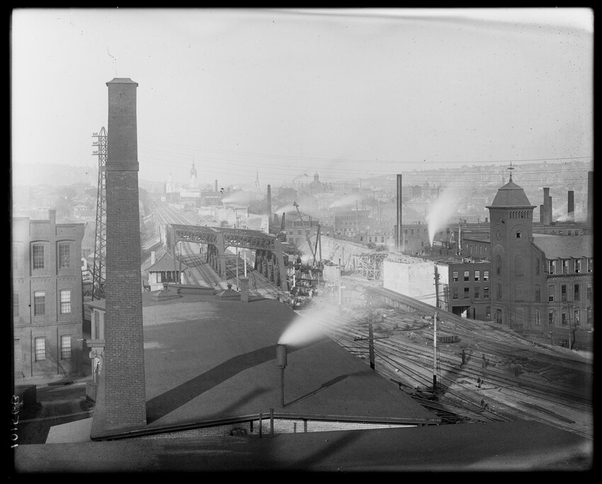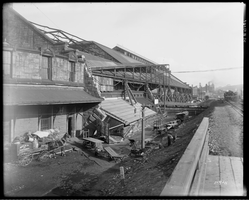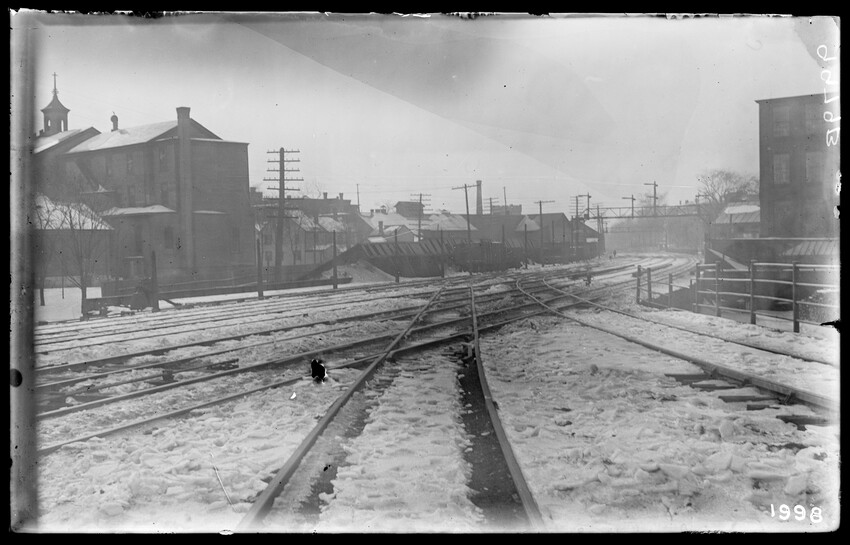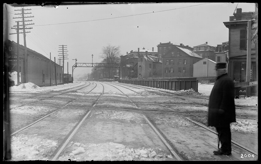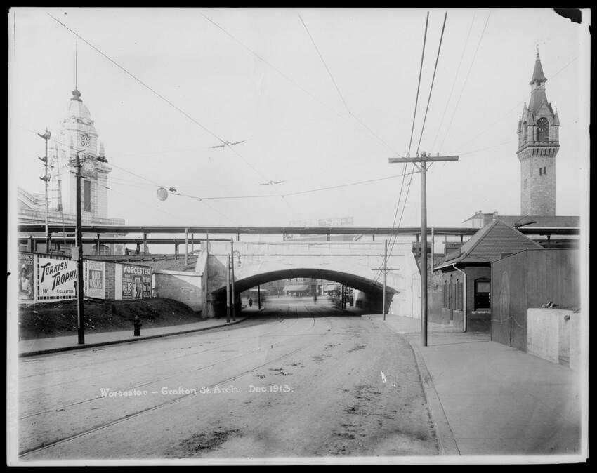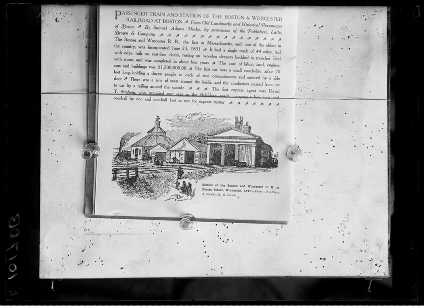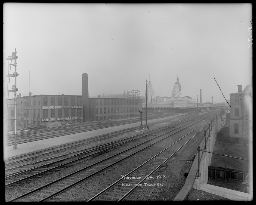 Junction of Illinois and Gates Streets, looking west, Grade Crossing elimination project, Worcester, Mass., 9973-B Wall east of Gardner Street, looking west, grade crossing elimination project, Worcester, Mass., 9974-B Elimination of grade crossing project, Worcester, Mass., 9975-B Machine Shop, exterior, Worcester, Mass., 9976-B View along tracks during elimination of grade crossings, South Worcester, Worcester, Mass., 9977-B Switch stand, Worcester, Mass., 9978-B Looking west from viaduct, Worcester, Mass., 9979-B Tracks looking southeast at Gates Street, South Worcester, Worcester, Mass., 9980-B Green Street, looking east, Worcester, Mass., 9981-B Green Street, looking west, Worcester, Mass., 9982-B West of Hammond Street, looking west, Worcester, Mass., 9983-B View during construction of bridges for elimination of grade crossings, Gardner Street arch, South Worcester, Worcester, Mass., 9984-B View at Hammond Street, looking east before elimination of grade crossings, Worcester, Mass., 9985-B Looking east from Gardner Street crossing, Worcester, Mass., 9986-B Elimination of grade crossing project, South Worcester, Worcester, Mass., 9987-B Maddison Street looking east, clock tower of old station in background, Worcester, Mass., 9988-B Madison Street, looking west, Worcester, Mass., 9989-B During elimination of grade crossings, Boston and Albany coal pockets, South Worcester, Worcester, 9990-B During grade crossing elimination project, Worcester, Mass., 9991-B During elimination of grade crossings, tracks at Crompton and Knowles Loom Works, looking west, South Worcester, Worcester, Mass., 9992-B During elimination of grade crossings, looking east from Grand Street Crossing, South Worcester, Worcester, Mass., 9993-B During elimination of grade crossings, looking east from Grand Street Crossing, South Worcester, Worcester, Mass., 9994-B View at Washington Street, looking east, clock tower of old railroad station in background, taken prior to construction of new railroad station and elimination of grade crossing in 1909, Worcester, Ma… View at Madison Street, looking west, taken during elimination of grade crossing, Worcester, Mass., 9996-B Construction of new power house, looking north, Worcester, Mass., 10149-B Franklin Street Bridge, girders, Worcester, Mass., 10150-B New Union Railroad Station, boiler, Worcester, Mass., 10151-B New Union Railroad Station, construction, Worcester, Mass., 10152-B New Express Building, south side, construction, Worcester, Mass., 10153-B New Union Railroad station, construction, dismantling old railroad station, looking east from Grafton Street, Worcester, Mass., 10154-B Setting the Franklin Street girders for bridge in connection with new Union Railroad Station improvements and grade crossing elimination project, Worcester, Mass., 10155-B Junction with New Haven Railroad tracks known as South Worcester Junction, during grade crossing elimination project, scene looking east toward station, Worcester, Mass., 10156-B New Union Railroad Station, interior, view of stairway to offices, Worcester, Mass., 10157-B Old Union Railroad Station after closing as indicated by sign on door, porte cochere, Worcester, Mass., 10158-B Grafton Street Arch, looking north, old station on right and new on left, Worcester, Mass., 10159-B New Union Railroad Station, interior, waiting room showing ticket windows, Worcester, Mass., 10160-B New Union Railroad Station, almost finished, Worcester, Mass., 10161-B New Union Railroad Station, interior, dining room, Worcester, Mass., 10162-B New Union Railroad Station, interior, dining room, Worcester, Mass., 10163-B Washington Square, showing old Union Station on left and new one on right soon after opening, Worcester, Mass., 10164-B Wright Wire Co., exterior wall, also showing railroad cars, Worcester, Mass., 10165-B Old Union Railroad Station, interior, view in last days of its operation, showing boxcar, Worcester, Mass., 10166-B New Union Railroad Station, west end, looking east from signal tower #28, Worcester, Mass., 10167-B Dismantling of old Union Railroad Station, during construction of new station chang-over, Worcester, Mass., 10168-B Construction of new Union Railroad Station, looking east, south and west elevation, Worcester, Mass., 10169-B Drawing of Boston and Worcester Railroad Station, Worcester, Mass., 10170-B Temporary platforms during construction of new railroad station, looking east, Worcester, Mass., 10171-B Temporary platforms during construction of new station, Worcester, Mass., 10172-B Gates Street crossing taken in connection with South Worcester grade crossing elimination, Worcester, Mass., 10173-B Gates Street extension and crossing of tracks looking west, grade crossing elimination project, Worcester, Mass., 10174-B