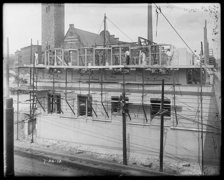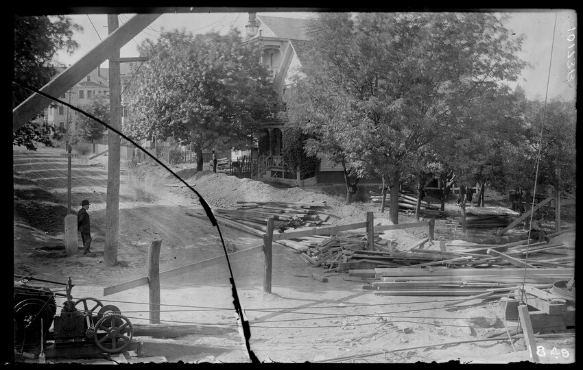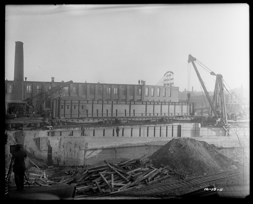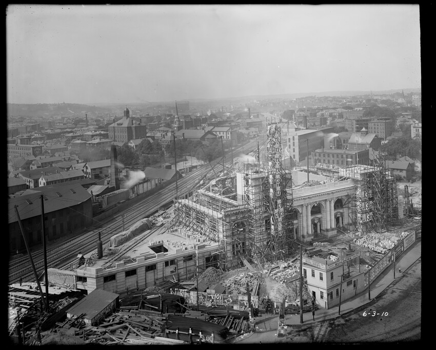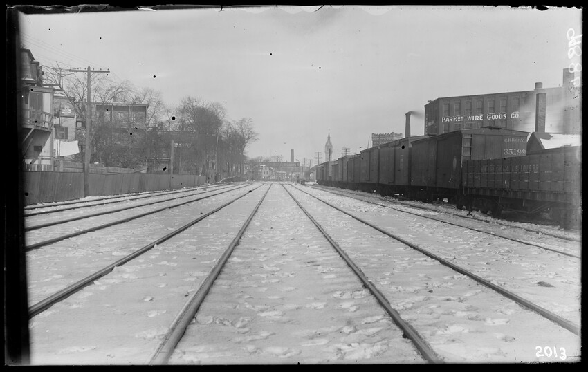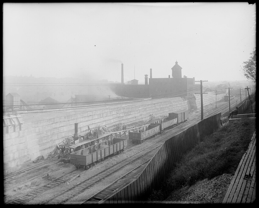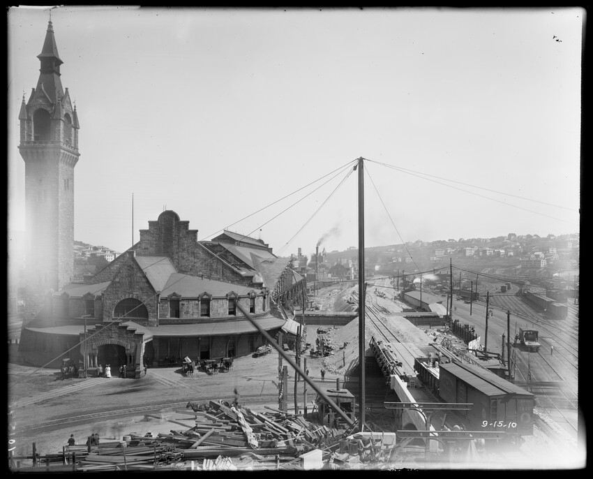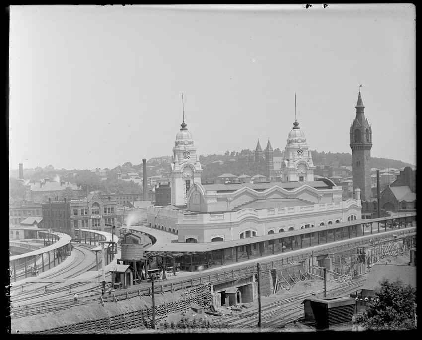 Junction of Illinois and Gates Streets, looking west, Grade Crossing elimination project, Worcester, Mass., 9973-B Wall east of Gardner Street, looking west, grade crossing elimination project, Worcester, Mass., 9974-B Elimination of grade crossing project, Worcester, Mass., 9975-B Machine Shop, exterior, Worcester, Mass., 9976-B View along tracks during elimination of grade crossings, South Worcester, Worcester, Mass., 9977-B Switch stand, Worcester, Mass., 9978-B Looking west from viaduct, Worcester, Mass., 9979-B Tracks looking southeast at Gates Street, South Worcester, Worcester, Mass., 9980-B Green Street, looking east, Worcester, Mass., 9981-B Green Street, looking west, Worcester, Mass., 9982-B West of Hammond Street, looking west, Worcester, Mass., 9983-B View during construction of bridges for elimination of grade crossings, Gardner Street arch, South Worcester, Worcester, Mass., 9984-B View at Hammond Street, looking east before elimination of grade crossings, Worcester, Mass., 9985-B Looking east from Gardner Street crossing, Worcester, Mass., 9986-B Elimination of grade crossing project, South Worcester, Worcester, Mass., 9987-B Maddison Street looking east, clock tower of old station in background, Worcester, Mass., 9988-B Madison Street, looking west, Worcester, Mass., 9989-B During elimination of grade crossings, Boston and Albany coal pockets, South Worcester, Worcester, 9990-B During grade crossing elimination project, Worcester, Mass., 9991-B During elimination of grade crossings, tracks at Crompton and Knowles Loom Works, looking west, South Worcester, Worcester, Mass., 9992-B During elimination of grade crossings, looking east from Grand Street Crossing, South Worcester, Worcester, Mass., 9993-B During elimination of grade crossings, looking east from Grand Street Crossing, South Worcester, Worcester, Mass., 9994-B View at Washington Street, looking east, clock tower of old railroad station in background, taken prior to construction of new railroad station and elimination of grade crossing in 1909, Worcester, Ma… View at Madison Street, looking west, taken during elimination of grade crossing, Worcester, Mass., 9996-B Construction of new power house, looking north, Worcester, Mass., 10149-B Franklin Street Bridge, girders, Worcester, Mass., 10150-B New Union Railroad Station, boiler, Worcester, Mass., 10151-B New Union Railroad Station, construction, Worcester, Mass., 10152-B New Express Building, south side, construction, Worcester, Mass., 10153-B New Union Railroad station, construction, dismantling old railroad station, looking east from Grafton Street, Worcester, Mass., 10154-B Setting the Franklin Street girders for bridge in connection with new Union Railroad Station improvements and grade crossing elimination project, Worcester, Mass., 10155-B Junction with New Haven Railroad tracks known as South Worcester Junction, during grade crossing elimination project, scene looking east toward station, Worcester, Mass., 10156-B New Union Railroad Station, interior, view of stairway to offices, Worcester, Mass., 10157-B Old Union Railroad Station after closing as indicated by sign on door, porte cochere, Worcester, Mass., 10158-B Grafton Street Arch, looking north, old station on right and new on left, Worcester, Mass., 10159-B New Union Railroad Station, interior, waiting room showing ticket windows, Worcester, Mass., 10160-B New Union Railroad Station, almost finished, Worcester, Mass., 10161-B New Union Railroad Station, interior, dining room, Worcester, Mass., 10162-B New Union Railroad Station, interior, dining room, Worcester, Mass., 10163-B Washington Square, showing old Union Station on left and new one on right soon after opening, Worcester, Mass., 10164-B Wright Wire Co., exterior wall, also showing railroad cars, Worcester, Mass., 10165-B Old Union Railroad Station, interior, view in last days of its operation, showing boxcar, Worcester, Mass., 10166-B New Union Railroad Station, west end, looking east from signal tower #28, Worcester, Mass., 10167-B Dismantling of old Union Railroad Station, during construction of new station chang-over, Worcester, Mass., 10168-B Construction of new Union Railroad Station, looking east, south and west elevation, Worcester, Mass., 10169-B Drawing of Boston and Worcester Railroad Station, Worcester, Mass., 10170-B Temporary platforms during construction of new railroad station, looking east, Worcester, Mass., 10171-B Temporary platforms during construction of new station, Worcester, Mass., 10172-B Gates Street crossing taken in connection with South Worcester grade crossing elimination, Worcester, Mass., 10173-B Gates Street extension and crossing of tracks looking west, grade crossing elimination project, Worcester, Mass., 10174-B