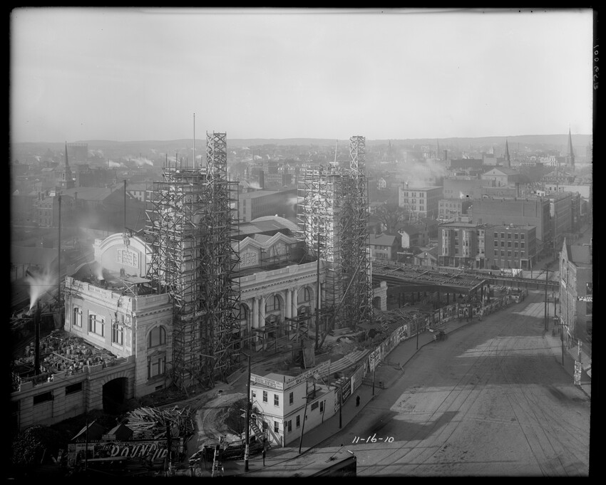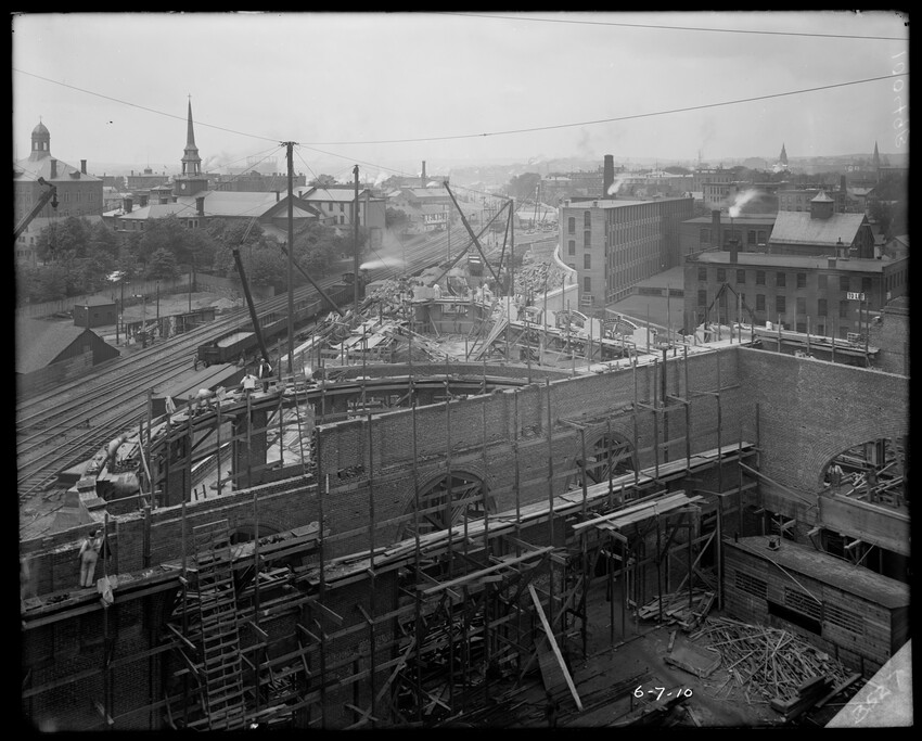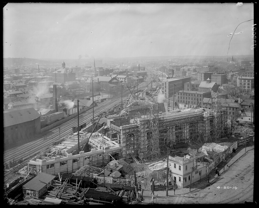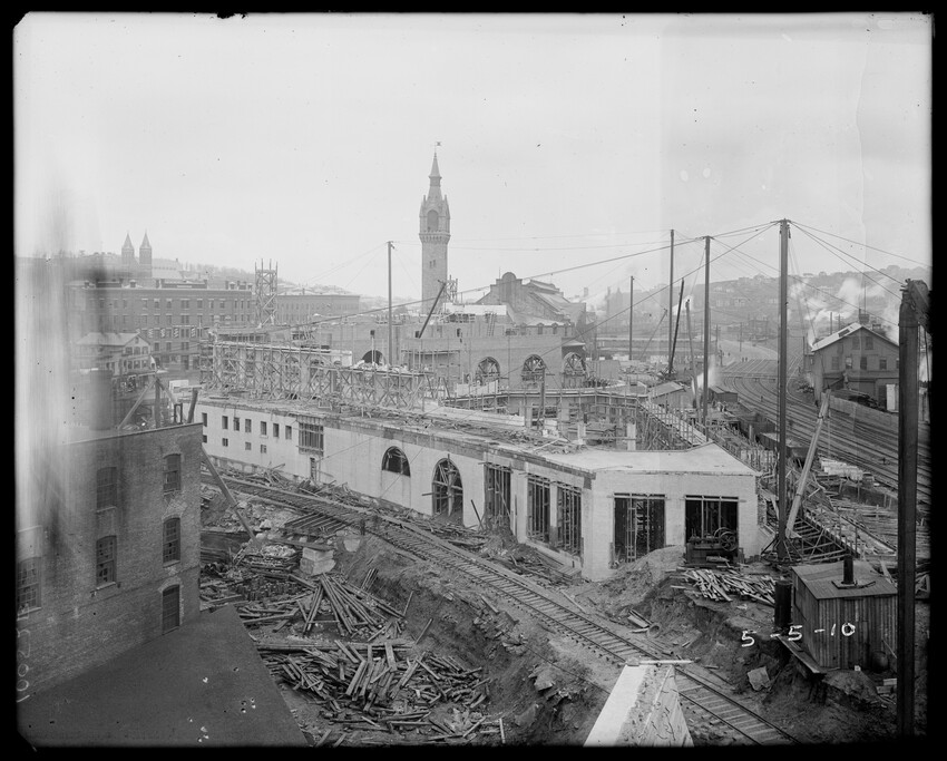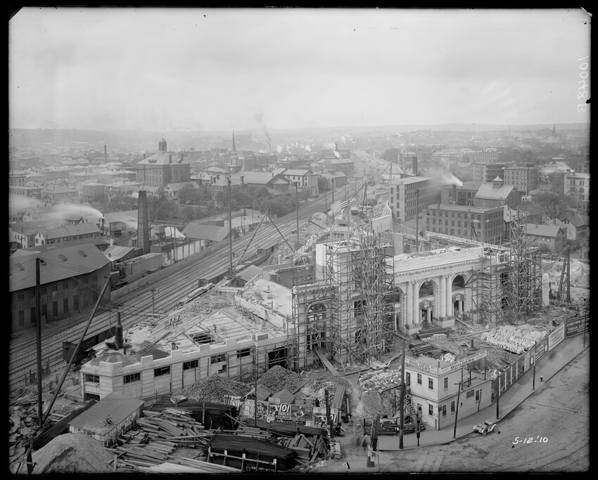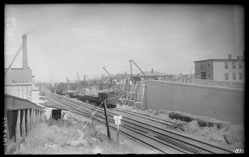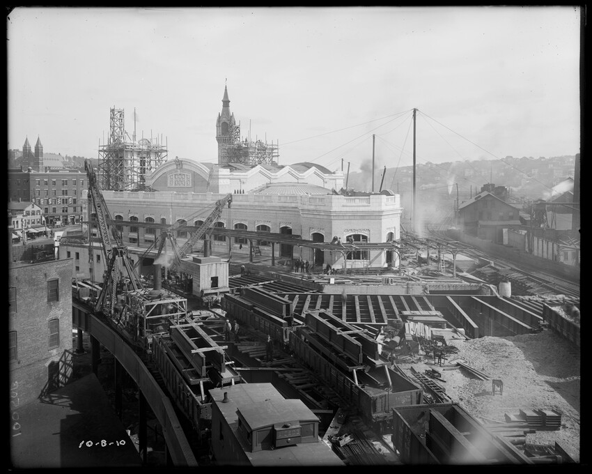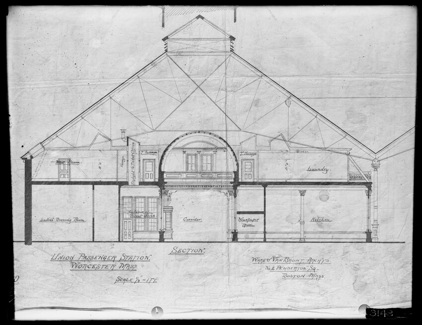 Gates Street extension looking south during the elimination of grade crossings at South Worcester, Worcester, Mass., 10175-B Leonard Street looking south, during grade crossing elimination project at South Worcester, Worcester, Mass., 10176-B Views looking southeast down tracks during grade crossing elimination project, Worcester, Mass., 10177-B Gates Street looking south during grade crossing elimination project at South Worcester, Worcester, Mass., 10178-B Tracks looking south at Gates Street extension during grade crossing elimination project, Worcester, Mass., 10179-B Tracks looking southwest at Gates Street, extension during grade crossing elimination project, Worcester, Mass., 10180-B Grade crossing elimination project in South Worcester, wood forms and wall at Gates Street extension, Worcester, Mass., 10181-B William Allen Sons Boiler Works at Washington Street, Worcester, Mass., 10182-B Tracks looking east at Gardner Street, Crompton and Knowles Loom Works on left, taken during grade crossing elimination project at South Worcester, Worcester, Mass., 10183-B Buildings off Madison Street looking west, Worcester, Mass., 10184-B Buildings off Madison Street, looking east, railroad on left, Worcester, Mass., 10185-B Blueprint of Old Union Railroad Station, Worcester, Mass., 10186-B Old Union Railroad Station looking west, Worcester, Mass., 10187-B Unidentified railroad station, 10188-B Old Union Railroad Station, looking east, Worcester, Mass., 10189-B Construction of new Union Railroad Station, exterior, Worcester, Mass., 10190-B Old Union Railroad Station, front of west side, showing trolley and carriages, Worcester, Mass., 10191-B Union Railroad Station, interior, Worcester, Mass., 10192-B Union Railroad Station, exterior during construction, Worcester, Mass., 10193-B Union Railroad Station, exterior, entrance from Washington Square, Worcester, Mass., 10194-B City Ticket Office, interior, Worcester, Mass., 10195-B Plymouth Street Railroad crossing, showing railroad cars, Worcester, Mass., 10196-B Retaining wall west of Grafton Street on main line of Boston & Albany Railroad, Worcester, Mass., 10197-B Retaining wall west of Grafton Street on main line of Boston & Albany Railroad, Worcester, Mass., 10198-B Construction of new Union Station, front elevation looking west from old station roof, Worcester, Mass., 10048-B Construction of new Union Station, looking down into unfinished area for concourses, view to west, Worcester, Mass., 10049-B Construction of new Union Station, west side looking east, showing steel work for elevated tracks and platform canopies, Worcester, Mass., 10050-B Construction of new Union Station, west side looking east, Worcester, Mass., 10051-B Construction of new Union Station, west side, looking east, old station in background, Worcester, Mass., 10052-B Construction of new Union Station showing west side and elevated tracks for Boston and Maine Railroad and New Haven Railroad trains, Worcester, Mass., 10053-B West side of new Union Station, looking east, showing start of elevation of tracks and building of bridges over streets, Worcester, Mass., 10054-B Construction of new Union Station, front elevation looking west from roof of old station, Worcester, Mass., 10055-B Construction of new Union Station, front elevation looking west from roof of old station, Worcester, Mass., 10056-B Construction of new Union Station, front elevation looking west from roof of old station, Worcester, Mass., 10057-B Old Union Station, southwest corner, elevating tracks above street level for new station, Worcester, Mass., 10058-B Washington Square and old Union Station, showing maze of railroad tracks, trolly tracks, and crossing gates. During construction of new station and dismantling of old train shed, Worcester, Mass., 100… Old Union Station, Boston and Maine Railroad, exit, 10060-B Old Union Station and temporary shelter and platform during construction of new Union Station, Worcester, Mass., 10061-B Construction of signal tower #28, in connection with new Union Station, Worcester, Mass., 10062-B Construction of new Union Station, rear of south side elevation looking north, old station in right background, Worcester, Mass., 10063-B Construction of new Union Station, rear elevation, looking north, showing start of raising tracks above street level, old station in right background, Worcester, Mass., 10064-B Construction of new Union Station, front elevation, looking west from old station roof, Washington Square in foreground, Worcester, Mass., 10065-B Construction of new Union Station, front elevation, looking west from old station roof, Washington Square in foreground, Worcester, Mass., 10066-B Construction of new Union Station, front elevation from old station, Worcester, Mass., 10067-B Construction of new Union Station, looking west, view from roof of old station, Worcester, Mass., 10068-B Construction of new Union Station, south side, looking east, Worcester, Mass., 10069-B Completed new Union Station from Tower #28 looking east, Worcester, Mass., 10070-B Construction of new Express Building on site of old station, Worcester, Mass., 10071-B Interior of city ticket office at 385 Main Street, Worcester, Mass., 10072-B Exterior of city ticket office at 385 Main Street, Worcester, Mass., 10073-B