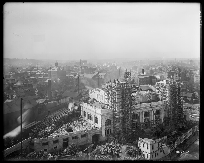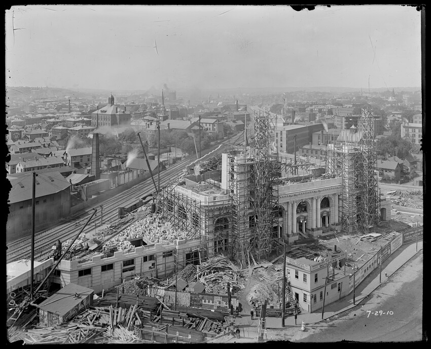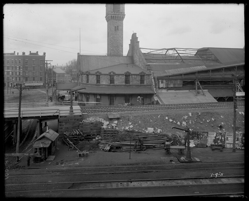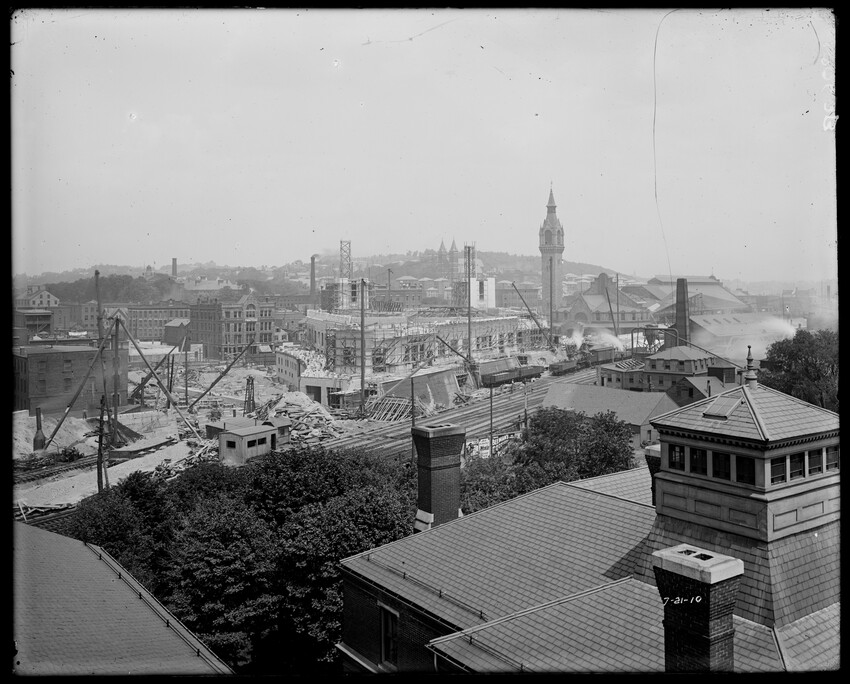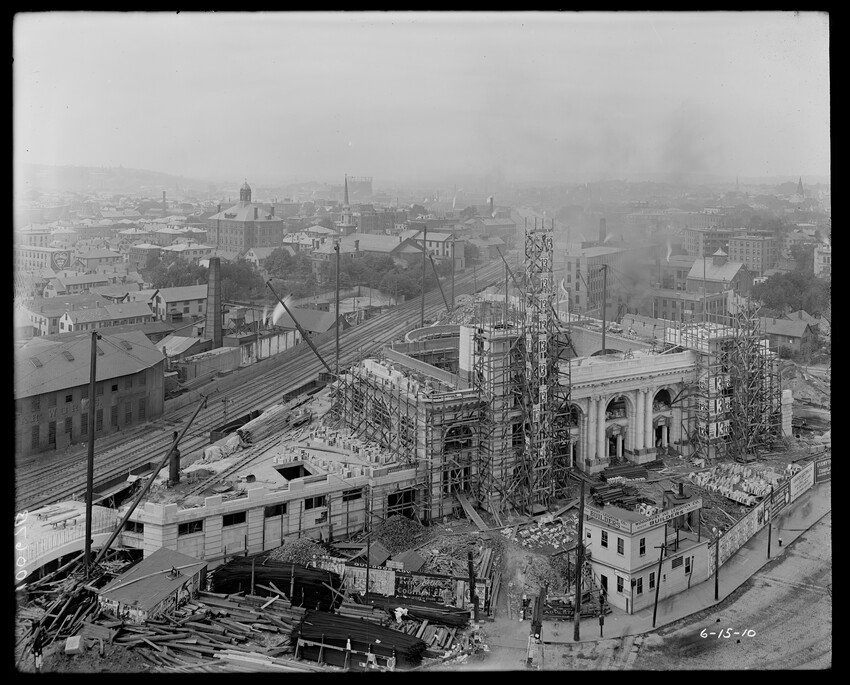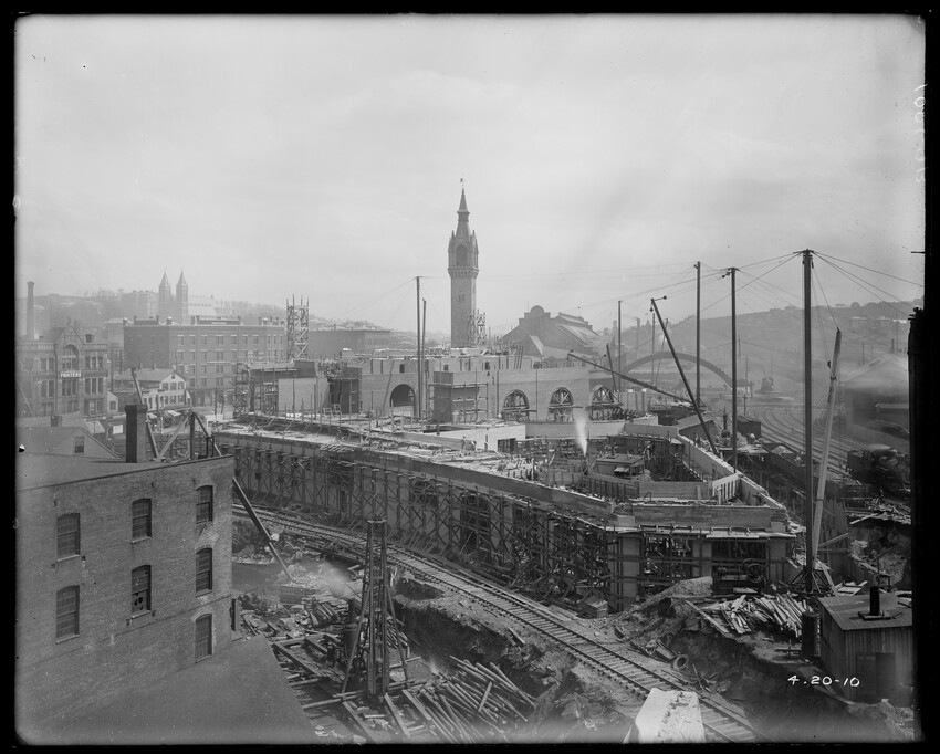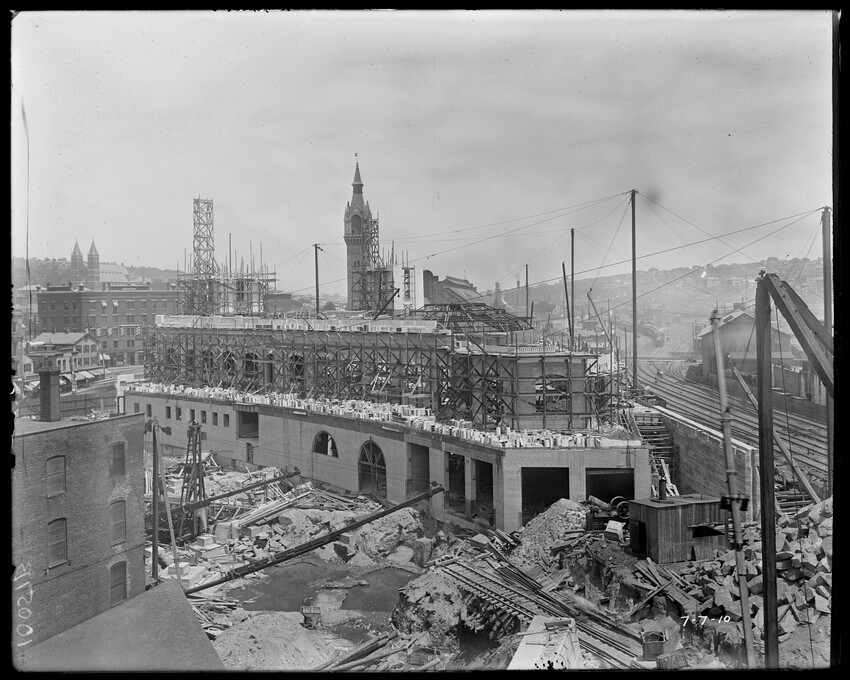Gates Street extension looking south during the elimination of grade crossings at South Worcester, Worcester, Mass., 10175-B Leonard Street looking south, during grade crossing elimination project at South Worcester, Worcester, Mass., 10176-B Views looking southeast down tracks during grade crossing elimination project, Worcester, Mass., 10177-B Gates Street looking south during grade crossing elimination project at South Worcester, Worcester, Mass., 10178-B Tracks looking south at Gates Street extension during grade crossing elimination project, Worcester, Mass., 10179-B Tracks looking southwest at Gates Street, extension during grade crossing elimination project, Worcester, Mass., 10180-B Grade crossing elimination project in South Worcester, wood forms and wall at Gates Street extension, Worcester, Mass., 10181-B William Allen Sons Boiler Works at Washington Street, Worcester, Mass., 10182-B Tracks looking east at Gardner Street, Crompton and Knowles Loom Works on left, taken during grade crossing elimination project at South Worcester, Worcester, Mass., 10183-B Buildings off Madison Street looking west, Worcester, Mass., 10184-B Buildings off Madison Street, looking east, railroad on left, Worcester, Mass., 10185-B Blueprint of Old Union Railroad Station, Worcester, Mass., 10186-B Old Union Railroad Station looking west, Worcester, Mass., 10187-B Unidentified railroad station, 10188-B Old Union Railroad Station, looking east, Worcester, Mass., 10189-B Construction of new Union Railroad Station, exterior, Worcester, Mass., 10190-B Old Union Railroad Station, front of west side, showing trolley and carriages, Worcester, Mass., 10191-B Union Railroad Station, interior, Worcester, Mass., 10192-B Union Railroad Station, exterior during construction, Worcester, Mass., 10193-B Union Railroad Station, exterior, entrance from Washington Square, Worcester, Mass., 10194-B City Ticket Office, interior, Worcester, Mass., 10195-B Plymouth Street Railroad crossing, showing railroad cars, Worcester, Mass., 10196-B Retaining wall west of Grafton Street on main line of Boston & Albany Railroad, Worcester, Mass., 10197-B Retaining wall west of Grafton Street on main line of Boston & Albany Railroad, Worcester, Mass., 10198-B Construction of new Union Station, front elevation looking west from old station roof, Worcester, Mass., 10048-B Construction of new Union Station, looking down into unfinished area for concourses, view to west, Worcester, Mass., 10049-B Construction of new Union Station, west side looking east, showing steel work for elevated tracks and platform canopies, Worcester, Mass., 10050-B Construction of new Union Station, west side looking east, Worcester, Mass., 10051-B Construction of new Union Station, west side, looking east, old station in background, Worcester, Mass., 10052-B Construction of new Union Station showing west side and elevated tracks for Boston and Maine Railroad and New Haven Railroad trains, Worcester, Mass., 10053-B West side of new Union Station, looking east, showing start of elevation of tracks and building of bridges over streets, Worcester, Mass., 10054-B Construction of new Union Station, front elevation looking west from roof of old station, Worcester, Mass., 10055-B Construction of new Union Station, front elevation looking west from roof of old station, Worcester, Mass., 10056-B Construction of new Union Station, front elevation looking west from roof of old station, Worcester, Mass., 10057-B Old Union Station, southwest corner, elevating tracks above street level for new station, Worcester, Mass., 10058-B Washington Square and old Union Station, showing maze of railroad tracks, trolly tracks, and crossing gates. During construction of new station and dismantling of old train shed, Worcester, Mass., 100… Old Union Station, Boston and Maine Railroad, exit, 10060-B Old Union Station and temporary shelter and platform during construction of new Union Station, Worcester, Mass., 10061-B Construction of signal tower #28, in connection with new Union Station, Worcester, Mass., 10062-B Construction of new Union Station, rear of south side elevation looking north, old station in right background, Worcester, Mass., 10063-B Construction of new Union Station, rear elevation, looking north, showing start of raising tracks above street level, old station in right background, Worcester, Mass., 10064-B Construction of new Union Station, front elevation, looking west from old station roof, Washington Square in foreground, Worcester, Mass., 10065-B Construction of new Union Station, front elevation, looking west from old station roof, Washington Square in foreground, Worcester, Mass., 10066-B Construction of new Union Station, front elevation from old station, Worcester, Mass., 10067-B Construction of new Union Station, looking west, view from roof of old station, Worcester, Mass., 10068-B Construction of new Union Station, south side, looking east, Worcester, Mass., 10069-B Completed new Union Station from Tower #28 looking east, Worcester, Mass., 10070-B Construction of new Express Building on site of old station, Worcester, Mass., 10071-B Interior of city ticket office at 385 Main Street, Worcester, Mass., 10072-B Exterior of city ticket office at 385 Main Street, Worcester, Mass., 10073-B