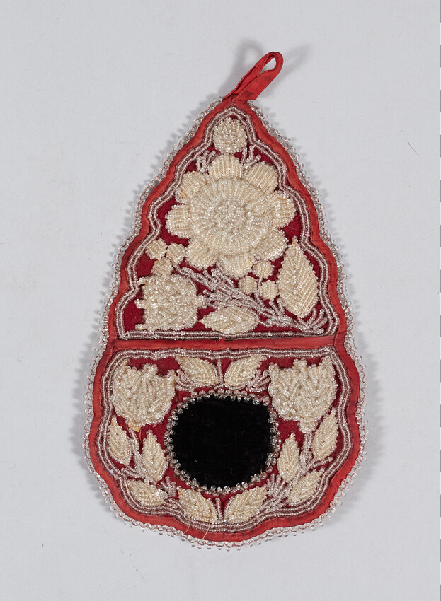A Niagara Falls style wall pocket of black and red wool and edged in red fabric tape. Adorned with three dimensional, thick clear beadwork, with outlining and edging in clear beads, and fabric hanging loop at top.
