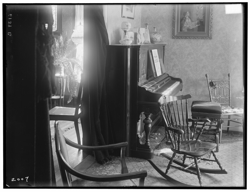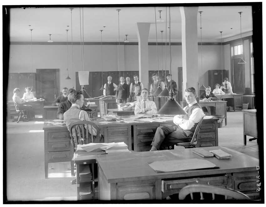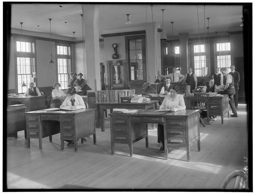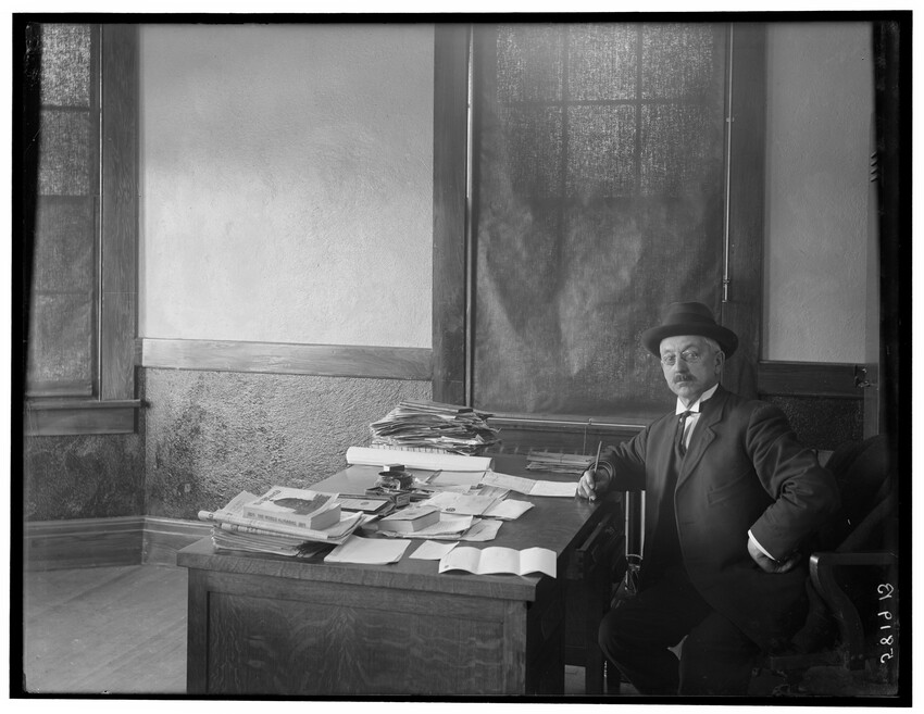 A man, identified as a freight agent, is sitting in an office environment in Pittsfield, Massachusetts. He is seated at a wooden desk, which is cluttered with papers, books, and inkwells. The man is wearing a suit, tie, and bowler hat, and he holds a pen in his right hand. The office features a wind...
