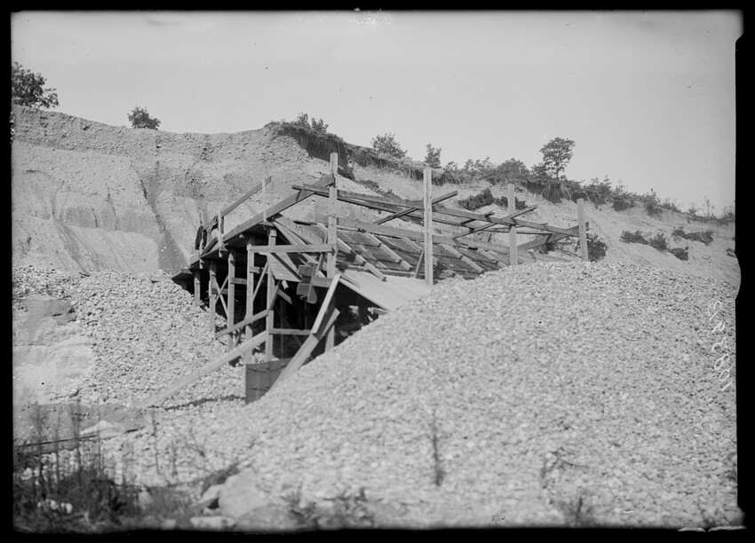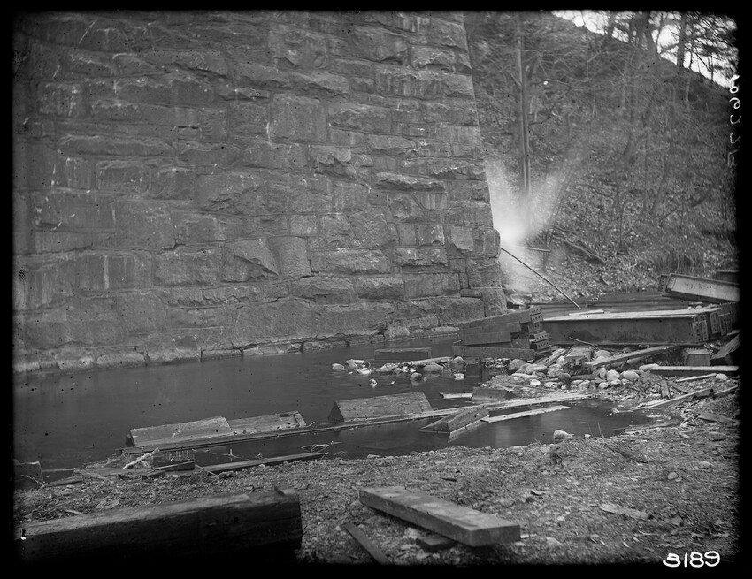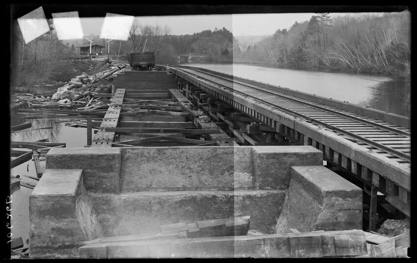The image shows a wooden railroad bridge spanning over a body of water. There are metal tracks running along the bridge, leading towards the background. Debris, including wooden planks and logs, is visible near the water. In the background on the left, there appears to be a small building or structu...