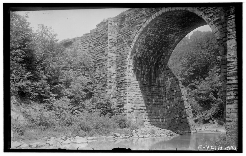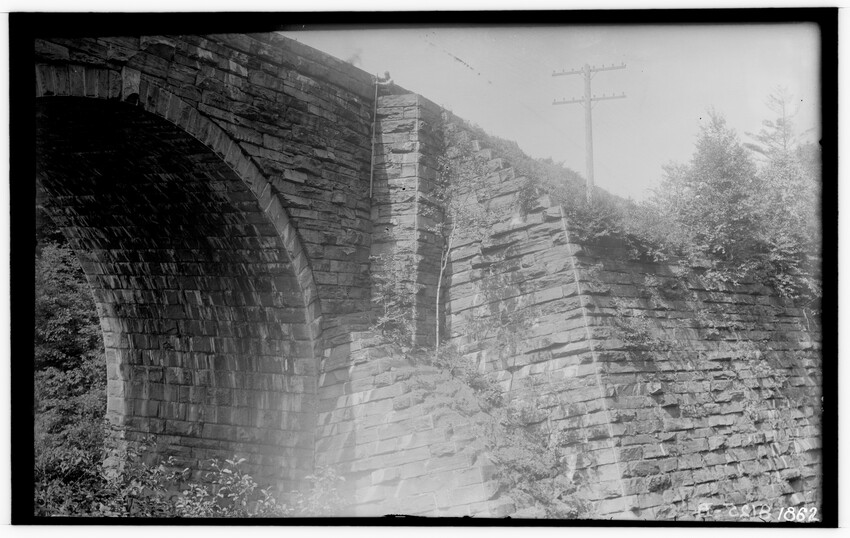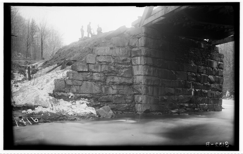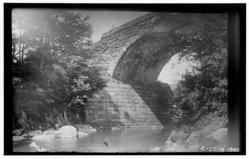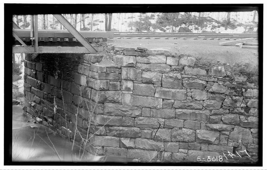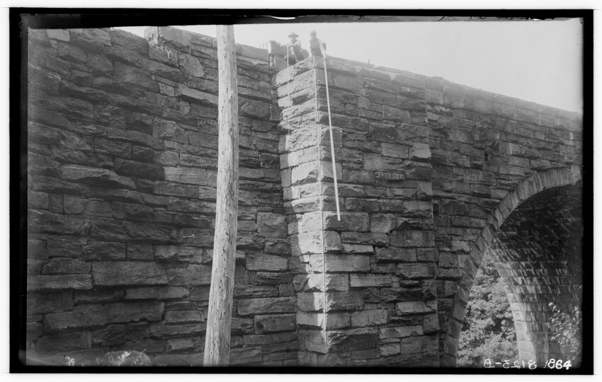 The image shows Bridge #144 in Middlefield, Massachusetts. In the foreground, there is a stone bridge structure with visible masonry work. On top of the bridge, two individuals stand near railroad tracks, one possibly using a surveying instrument on a tripod. In the background, a train is passing by...