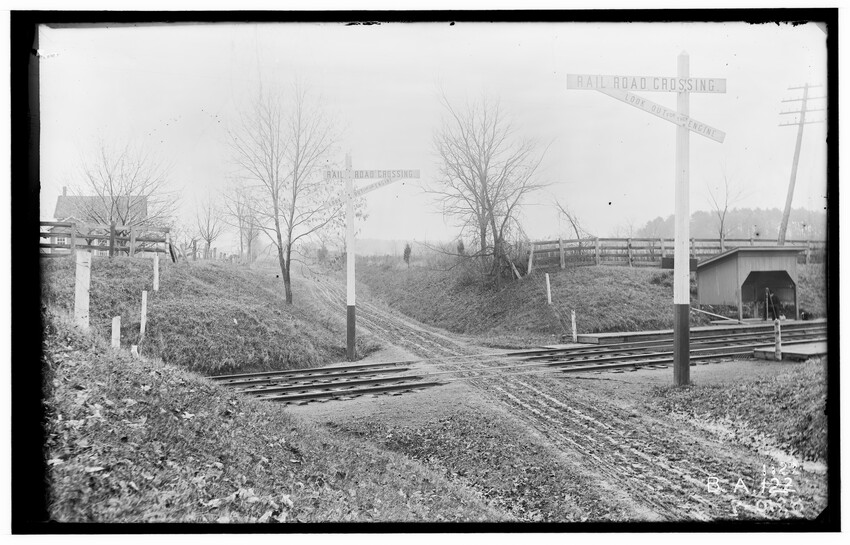 The image depicts Schermerhorn's crossing, located south of the railroad tracks in Schodack, New York. It features a dirt road, railroad tracks, and a "RAILROAD CROSSING" sign. In the background, there are several utility poles, trees, and a few buildings, including farmhouses or barns.
