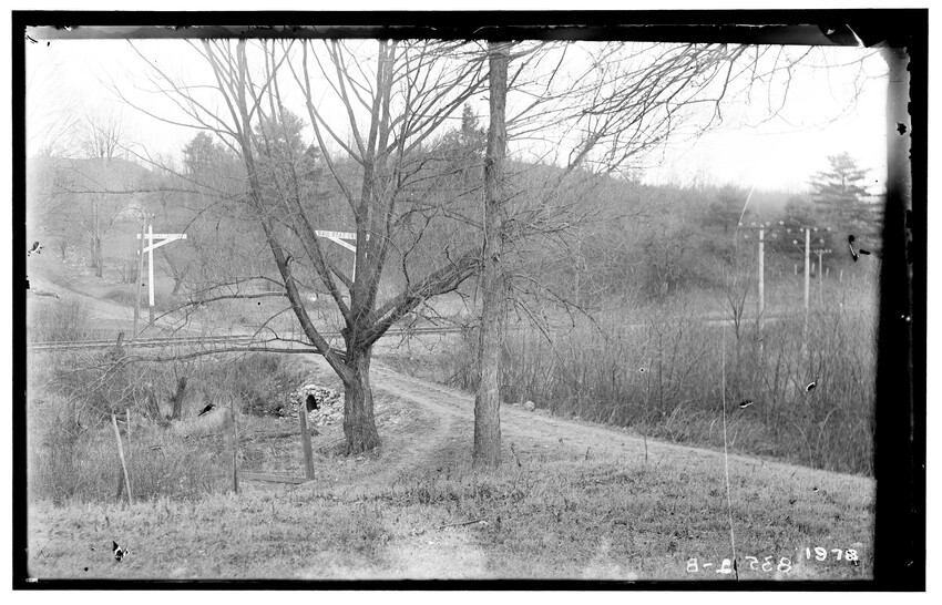 The image shows a rural scene in Chester, Massachusetts, featuring a man standing on a dirt path that winds through a grassy area. There are several trees without leaves and utility poles positioned along the path. In the background, there is a rail track with a hill behind it, and a small house par...