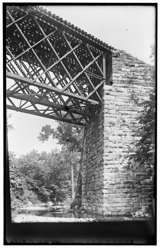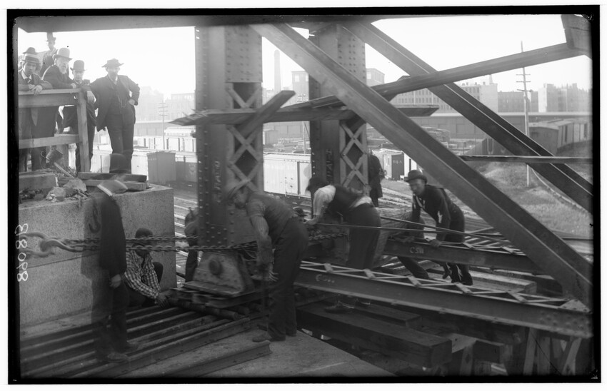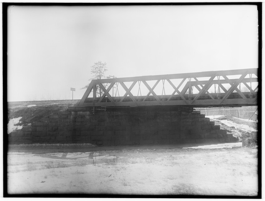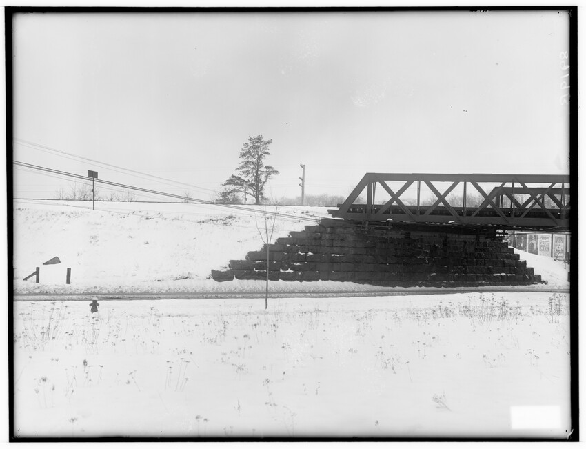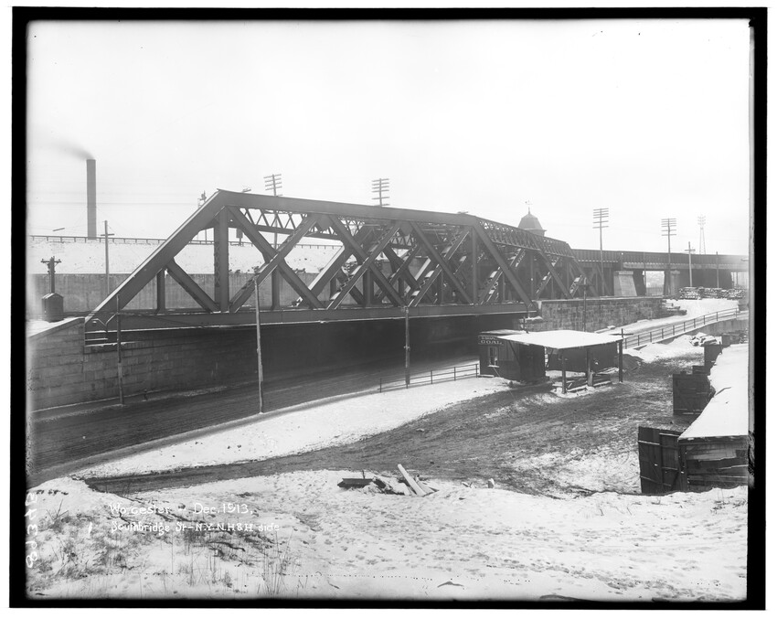The image depicts the Southbridge Street bridge in Worcester, Massachusetts. The bridge features a steel truss design and crosses over a roadway below. To the left, there are visible railway lines, signal posts, and stacks of timber. Buildings and rooftops are seen in the background, beyond the rail...