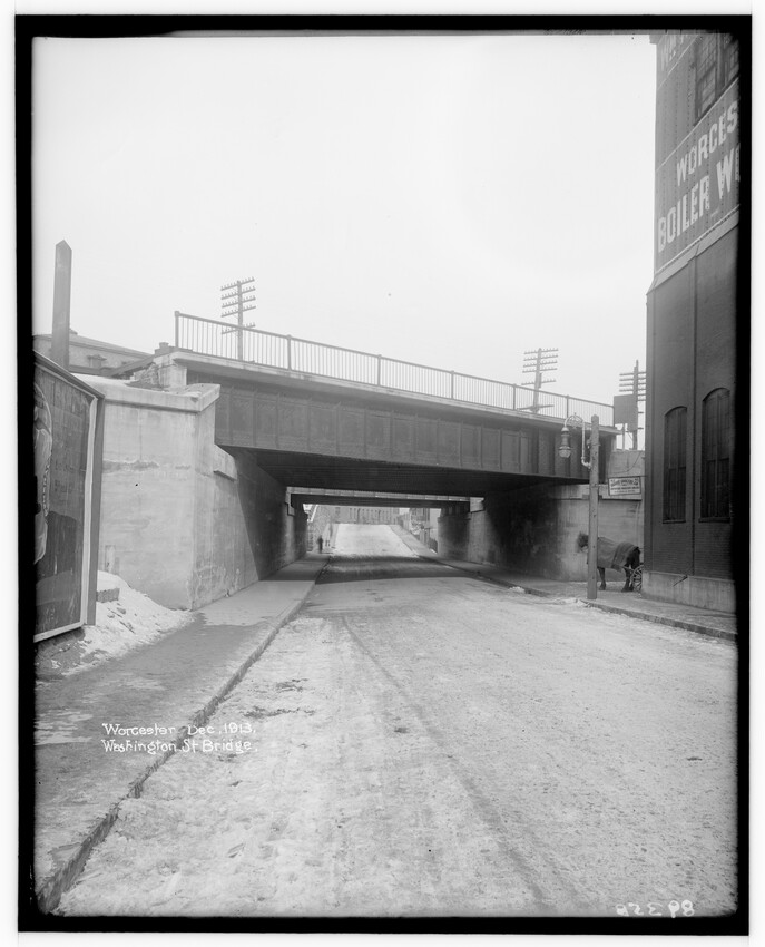 The image depicts the Southbridge Street bridge in Worcester, Massachusetts. The bridge features a steel truss design and crosses over a roadway below. To the left, there are visible railway lines, signal posts, and stacks of timber. Buildings and rooftops are seen in the background, beyond the rail...