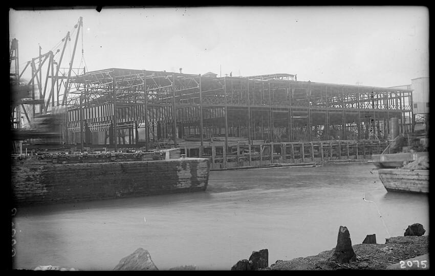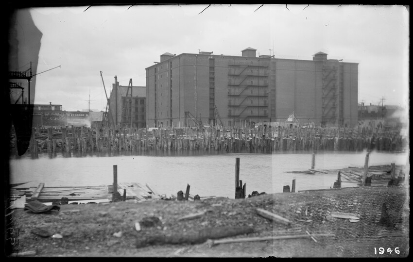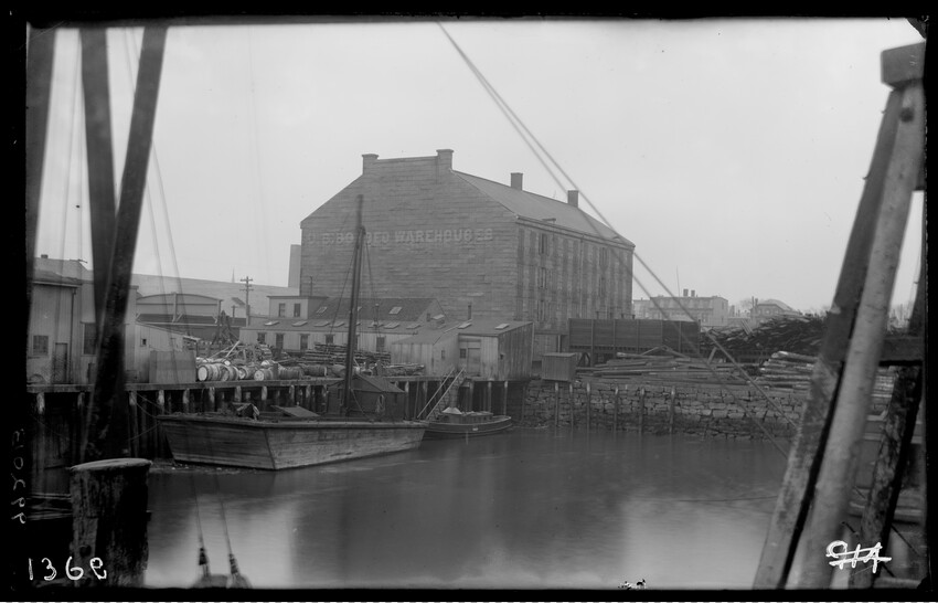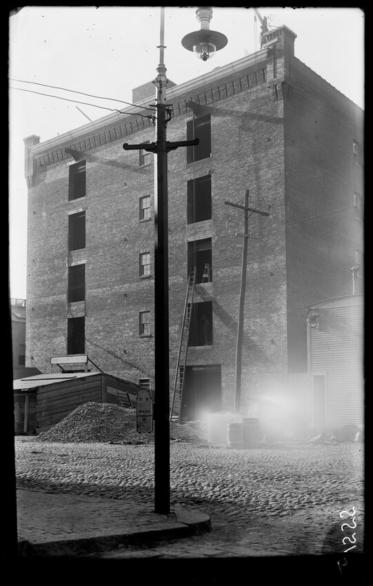 The image shows a multi-story brick warehouse on New Street, viewed from the northeast, in East Boston, Massachusetts. The building has several open windows and a long ladder is leaning against it, reaching up to one of the windows. In the foreground, a utility pole with wires and a streetlamp is vi...
