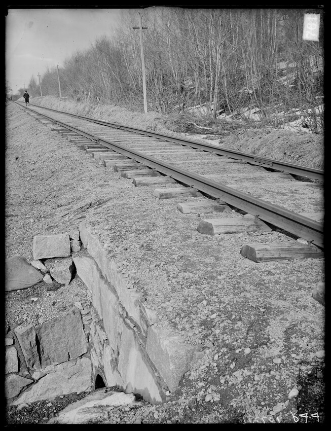 The image shows a stretch of railroad tracks running diagonally across a gravel-covered area. To the side of the tracks, a person is walking away from the camera. On the left, a line of utility poles follows the tracks. In the foreground, there is a stone-lined ditch or culvert beneath the tracks. L...