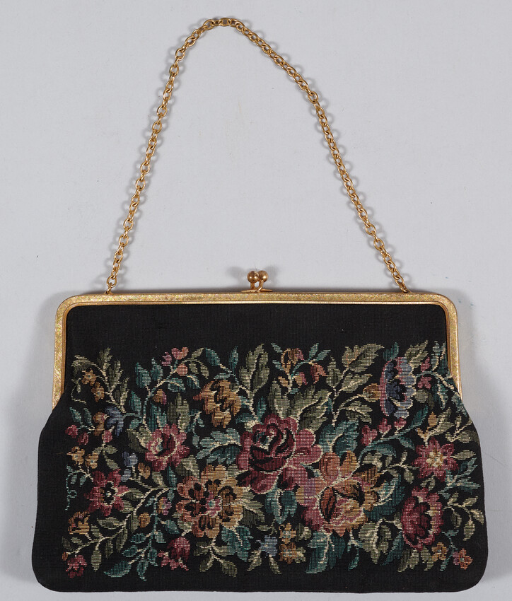 A black floral tapestry purse with yellow metal closure frame, clasp, and chain. Labelled "MADE IN WEST GERMANY WALBORG".