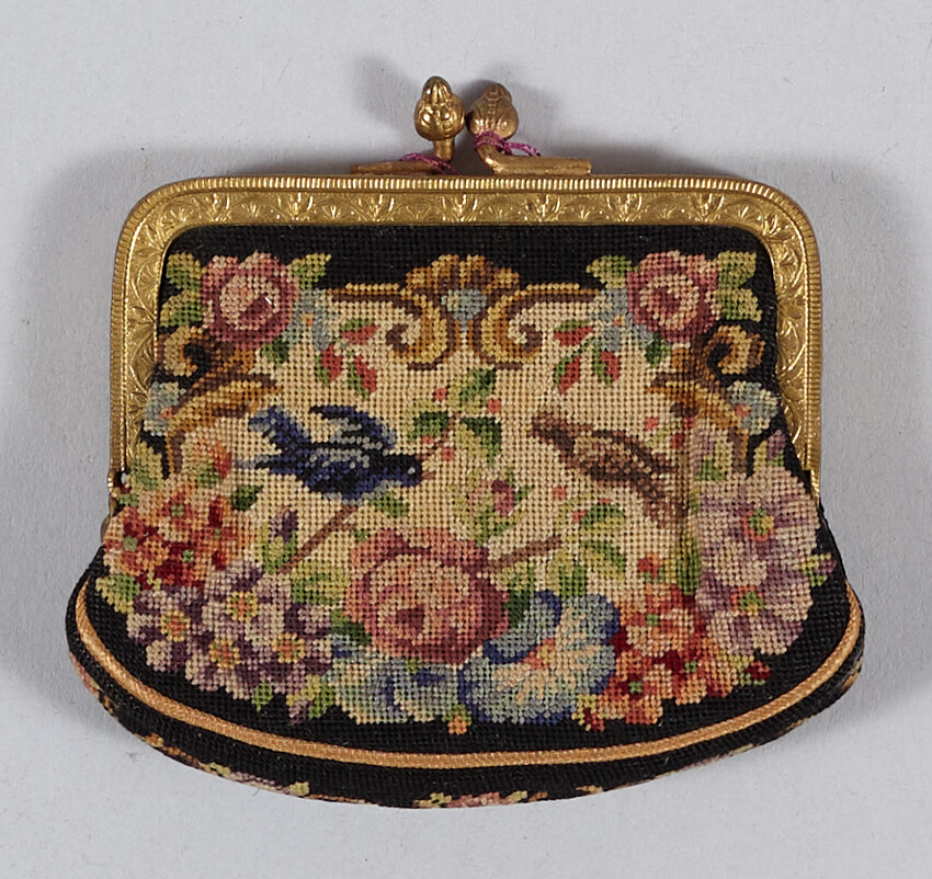 Petit point coin purse with birds and flowers on a cream and black background with yellow metal chased closure frame and clasp.